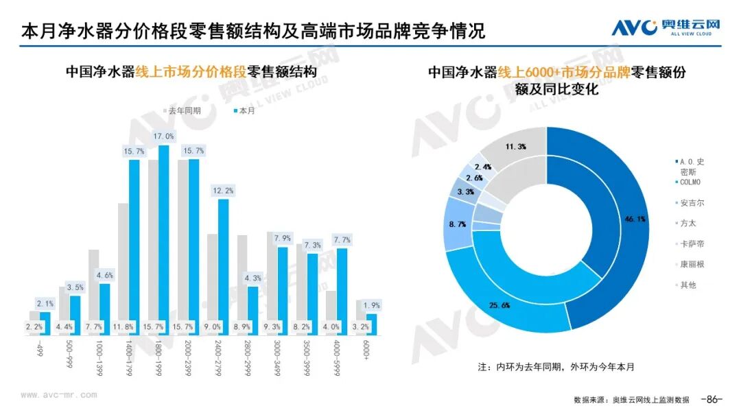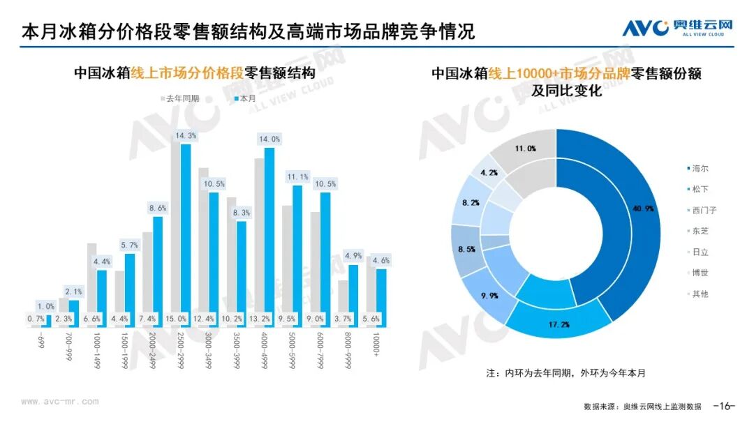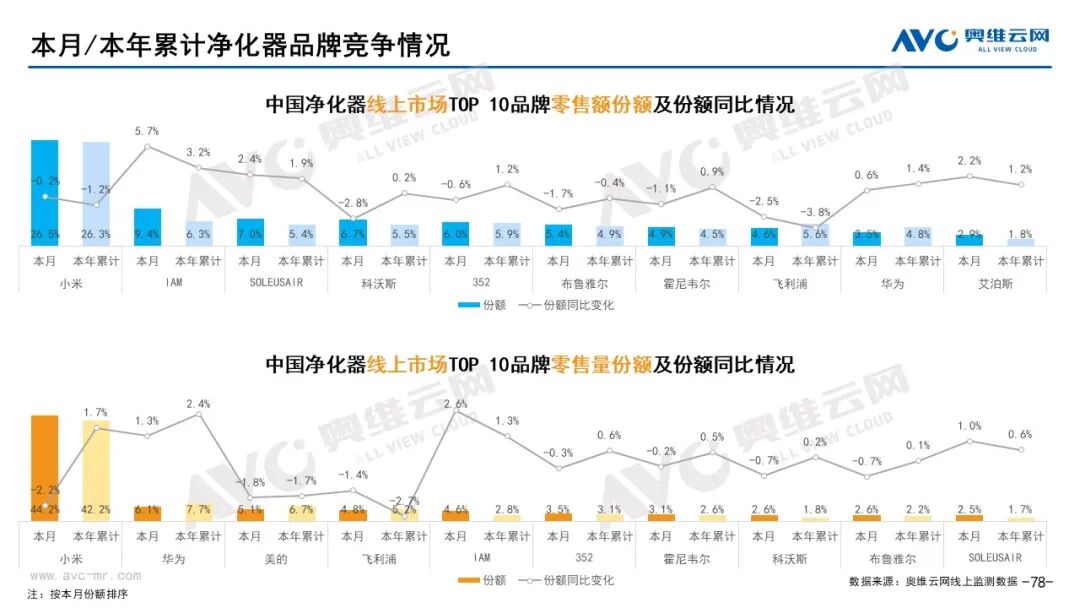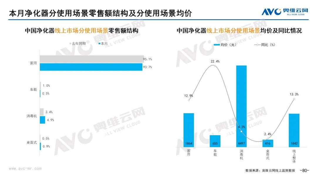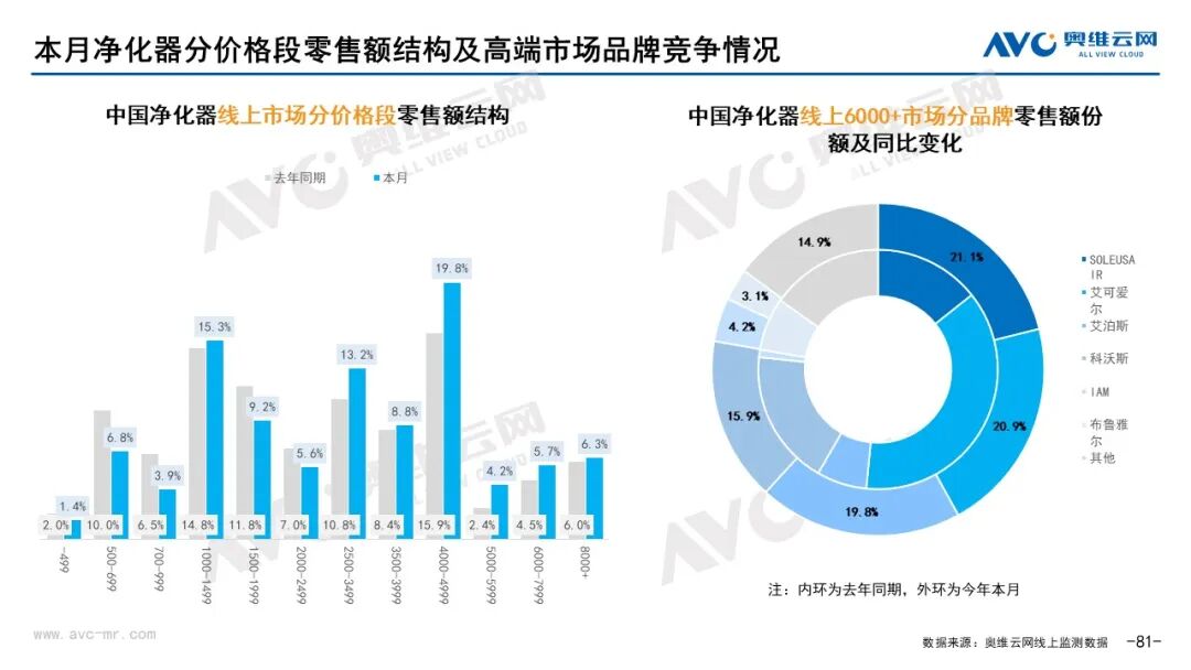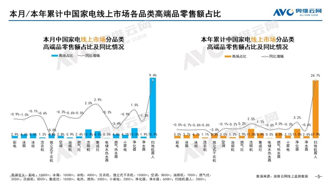 环电:据奥维云网(AVC)线上市场监测数据显示,本月环电主要品类中,净化器、净水器和扫地机器人线上零售额规模同比分别为-27.6%、-20.2%和-20.3%;净化器、净水器和扫地机器人的均价分为1842元、1915元和3286元,同比分别为13.3%、3.1%和4.5%;各品类中,高端品零售额占比分别为12.0%、1.9%和70.9%,同比分别为1.5%、-1.3%和9.4%。