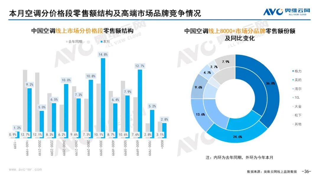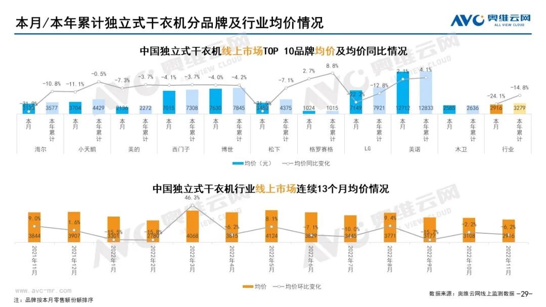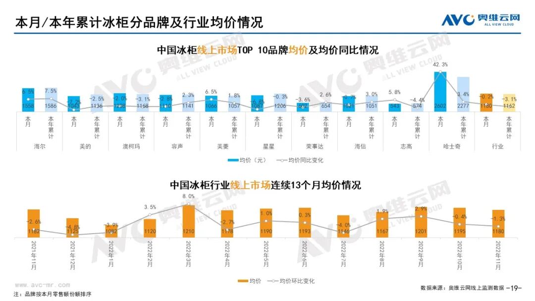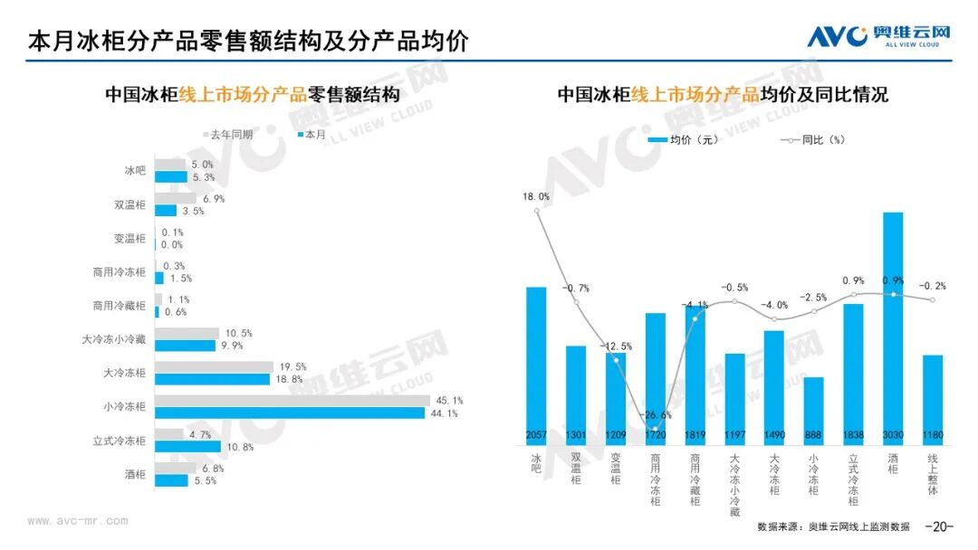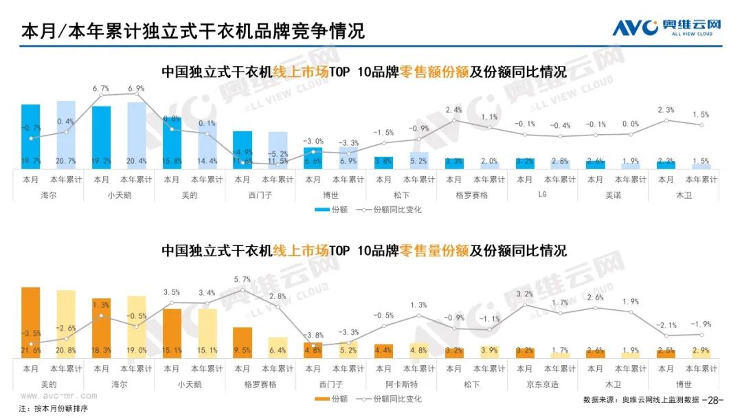 白电:据奥维云网(AVC)线上市场监测数据显示,本月白电各品类中,冰箱、冰柜、洗衣机、独立式干衣机和空调线上零售额规模同比分别为-12.8%、2.4%、-18.8%、68.1% 和5.0%;冰箱、冰柜、洗衣机、独立式干衣机和空调的均价分别为3026元、1180元、1803元、2916元和3174元,同比分别为3.0%、-0.2%、1.5%、-24.1% 和6.9%;各品类中,高端品零售额占比分别为4.6%、5.5%、1.2%、4.8% 和2.8%,同比分别为-1.0%、-0.1%、-0.6%、-5.0% 和-0.3%。
