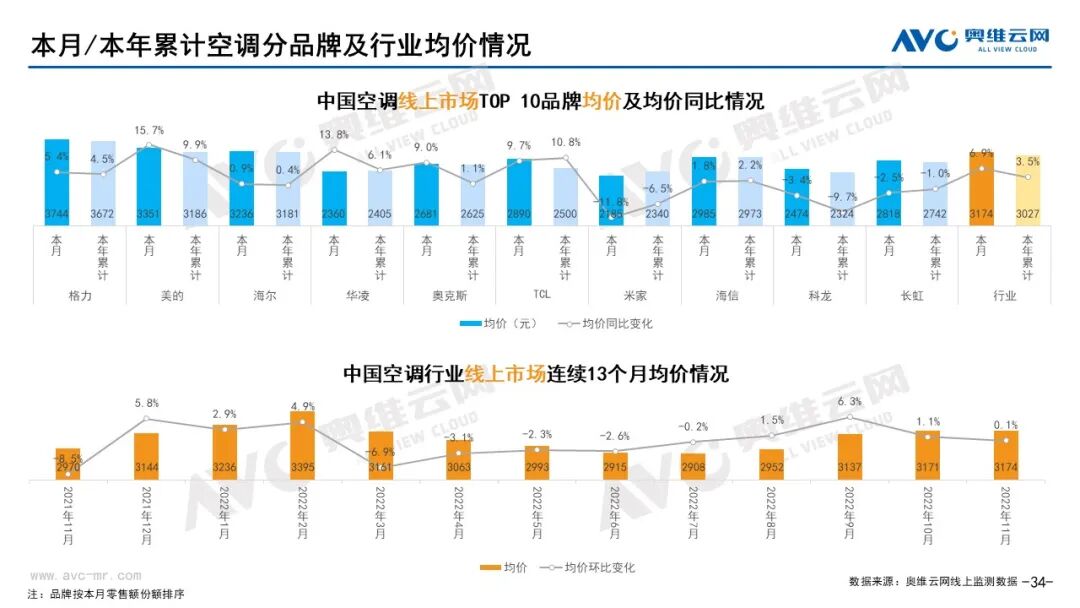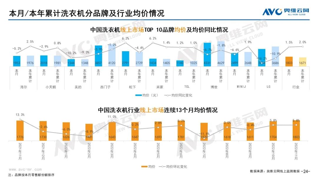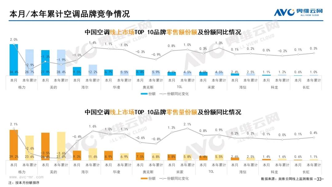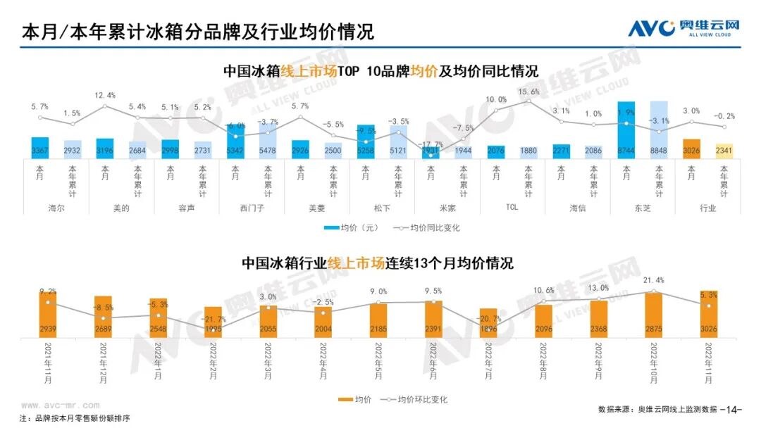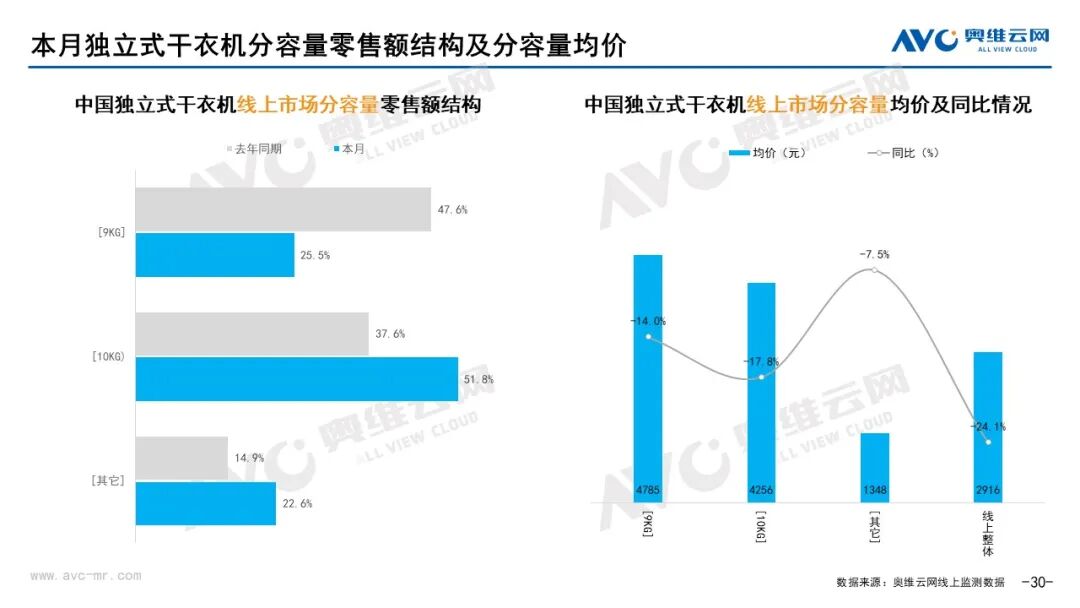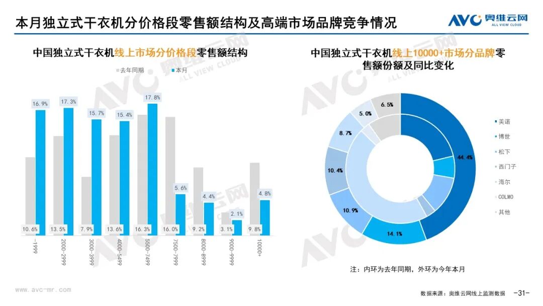 白电:据奥维云网(AVC)线上市场监测数据显示,本月白电各品类中,冰箱、冰柜、洗衣机、独立式干衣机和空调线上零售额规模同比分别为-12.8%、2.4%、-18.8%、68.1% 和5.0%;冰箱、冰柜、洗衣机、独立式干衣机和空调的均价分别为3026元、1180元、1803元、2916元和3174元,同比分别为3.0%、-0.2%、1.5%、-24.1% 和6.9%;各品类中,高端品零售额占比分别为4.6%、5.5%、1.2%、4.8% 和2.8%,同比分别为-1.0%、-0.1%、-0.6%、-5.0% 和-0.3%。