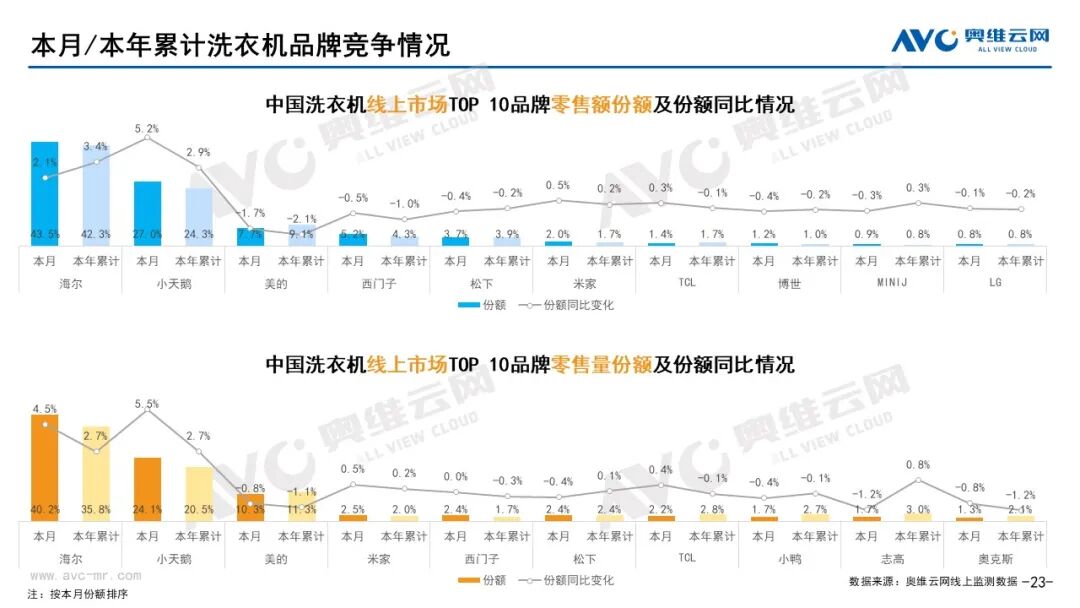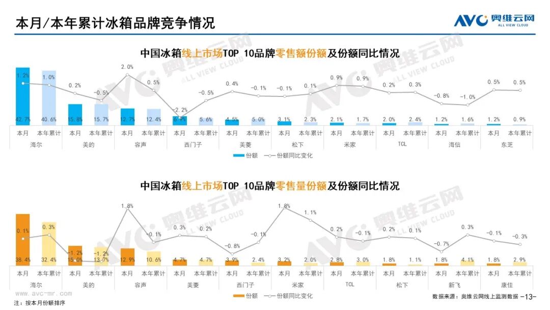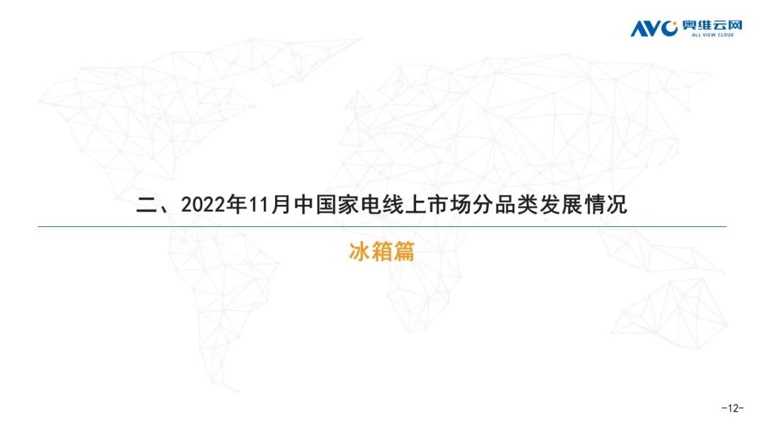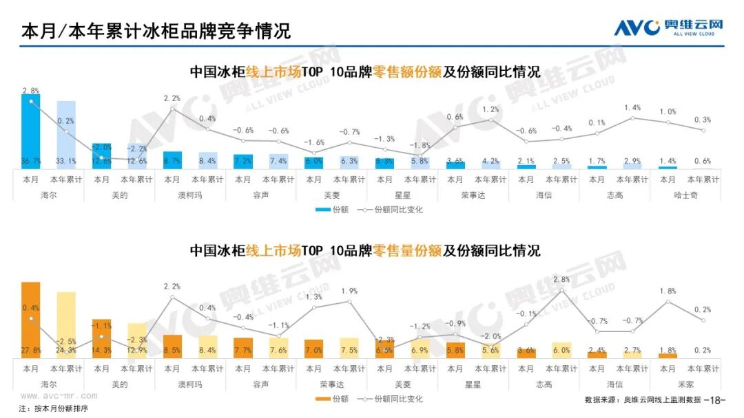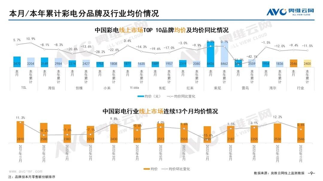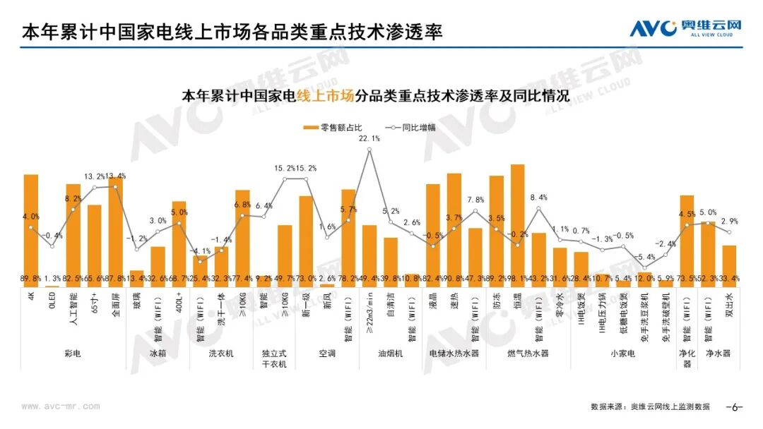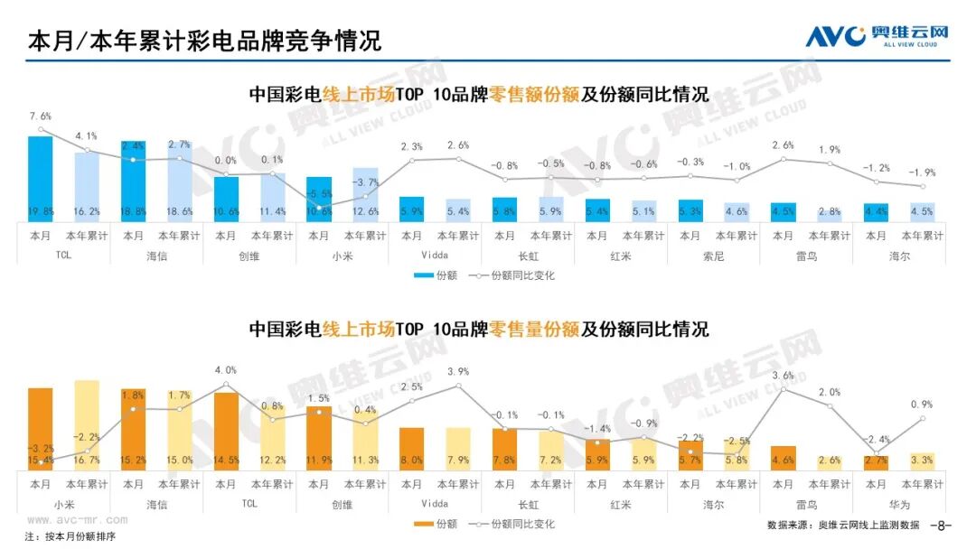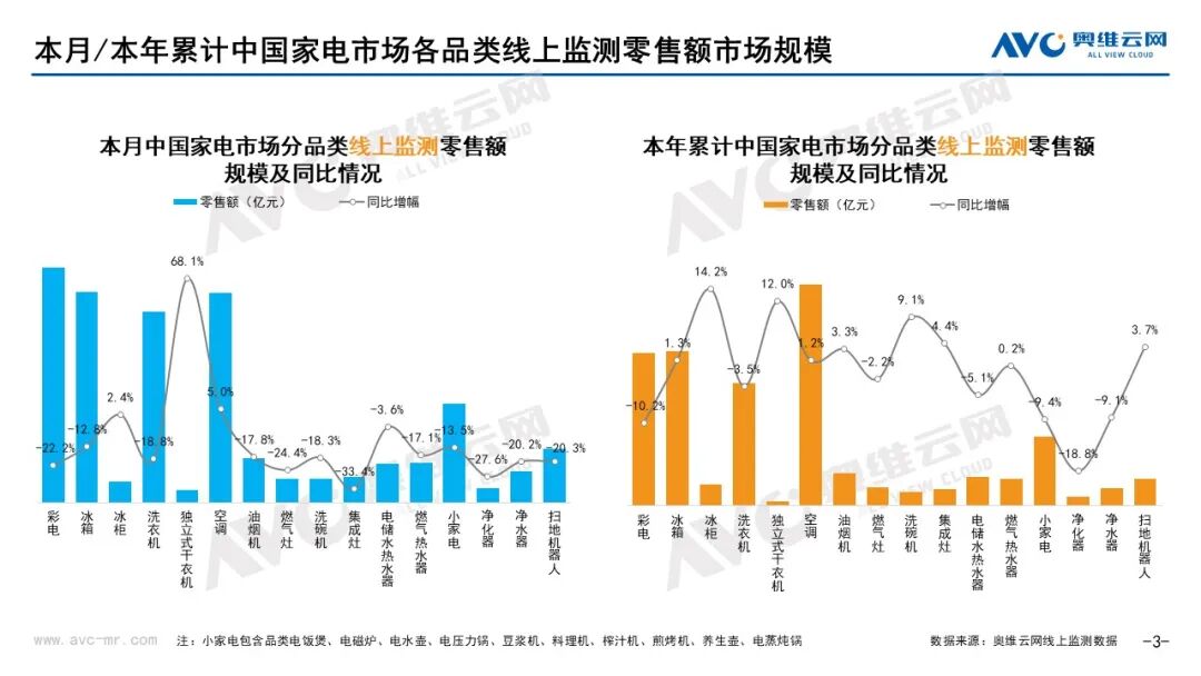 彩电:据奥维云网(AVC)线上市场监测数据显示,本月彩电线上零售额规模同比-22...