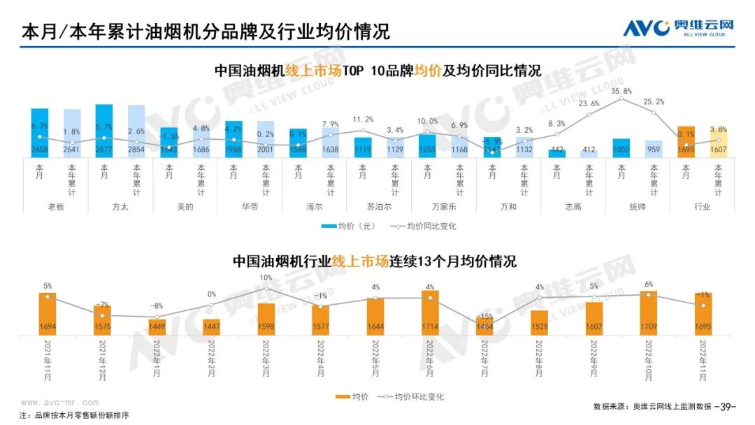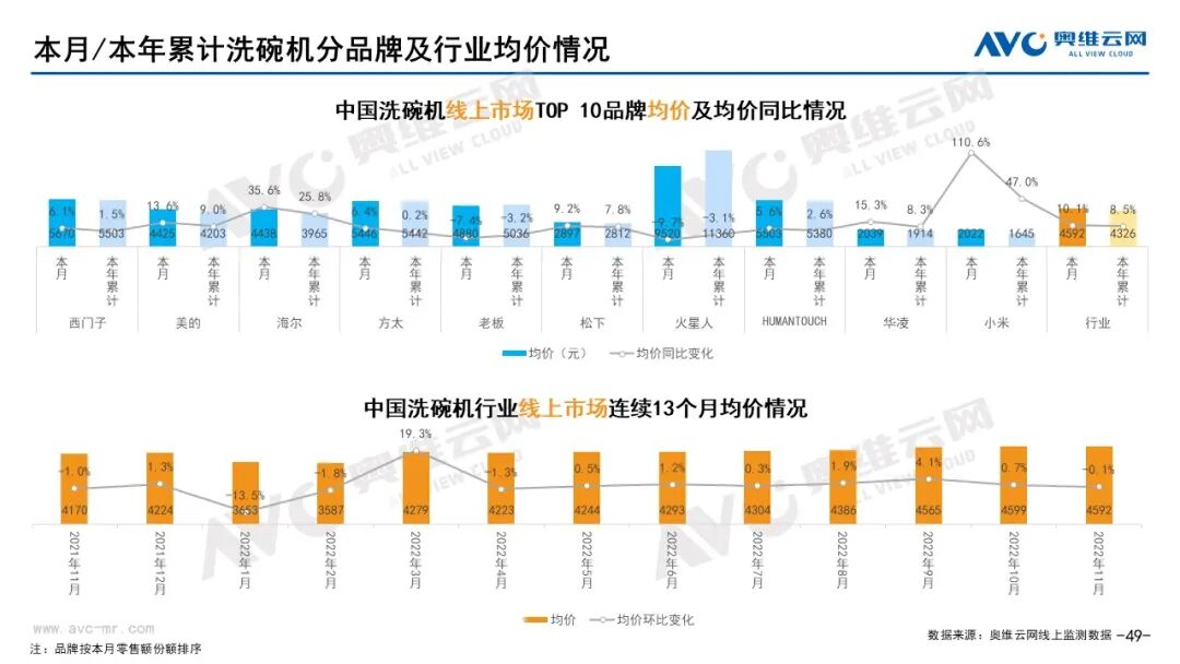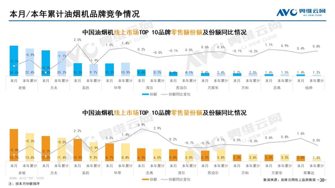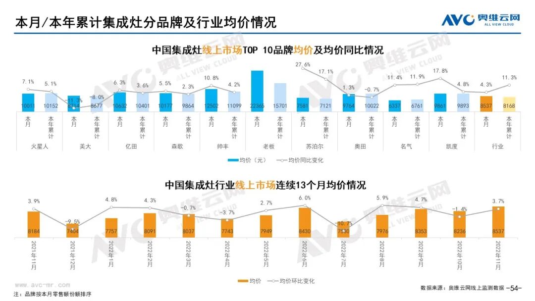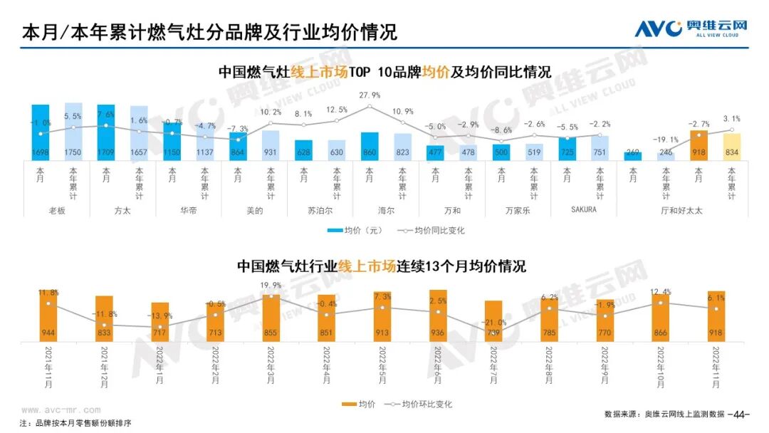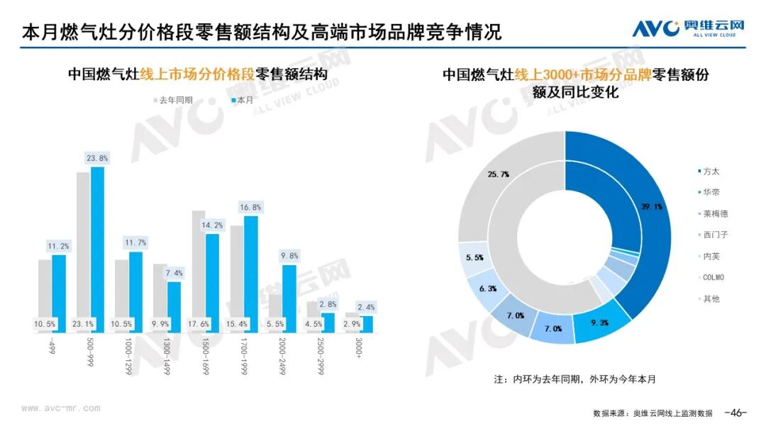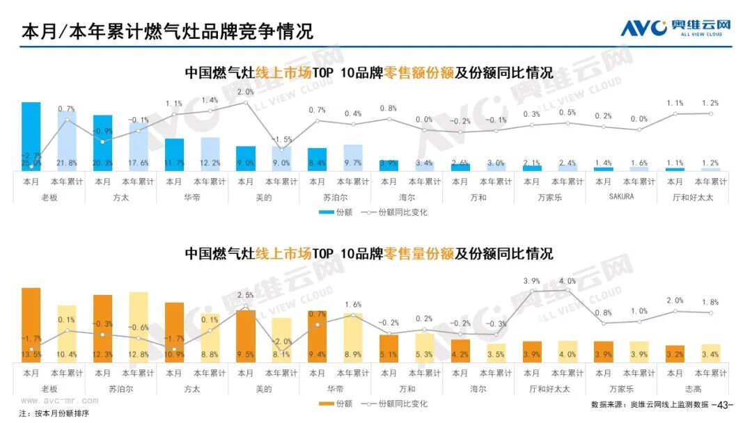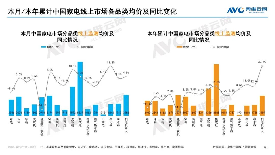 厨卫:据奥维云网(AVC)线上市场监测数据显示,本月厨卫主要品类中,油烟机、燃气灶、洗碗机、集成灶、电热和燃热的线上零售额规模同比分别为-17.8%、-24.4%、-18.3%、-33.4%、-3.6%和-17.1%;油烟机、燃气灶、洗碗机、集成灶、电热和燃热的均价分别为1695元、918元、4592元、8537元、1062元和1754元,同比分别为0.1%、-2.7%、10.1%、4.3%、-0.2%和-4.1%;各品类中,高端品零售额占比分别为0.9%、2.4%、10.4%、8.5%、0.5%和4.8%,同比分别为-0.6%、-0.5%、2.0%、2.9%、-0.3%和-3.4%。