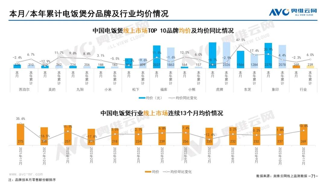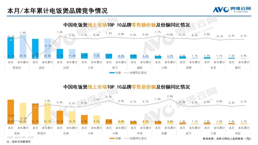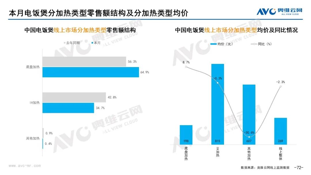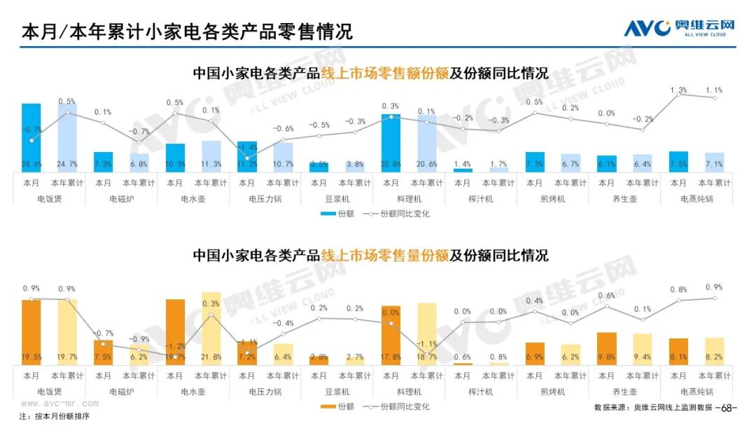小家电:据奥维云网(AVC)线上市场监测数据显示,本月小家电线上零售额规模同比-13.5%;均价为213元,同比5.1%;高端品零售额占比4.1%,同比-0.9%;各品类中,电饭煲IH加热类型产品零售额占比34.7%,同比-8.1%;从价格段来看,2000+的电饭煲零售额占比9.9%,同比-0.7%,破壁机零售额占比5.2%,同比-3.2%。