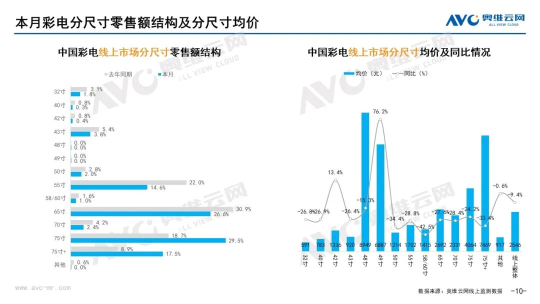 彩电:据奥维云网(AVC)线上市场监测数据显示,本月彩电线上零售额规模同比-22.2%;均价为2546元,同比-9.4%;15000+的彩电零售额占比2.9%,同比-0.9%;不同彩电尺寸中,75寸+彩电零售额占比17.5%,同比8.6%。