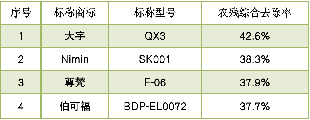 此时家庭常用清洗方式均有较好的去农残效果,其中淘米水的农残综合去除率为64.3%,对比发现,仅2款样品的表现优于淘米水。