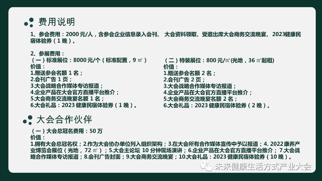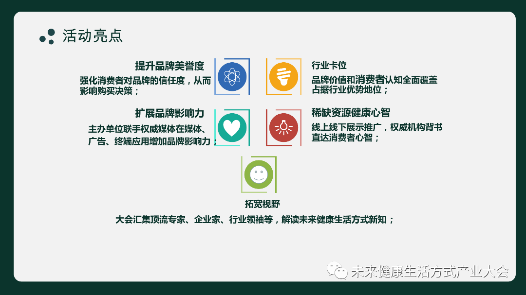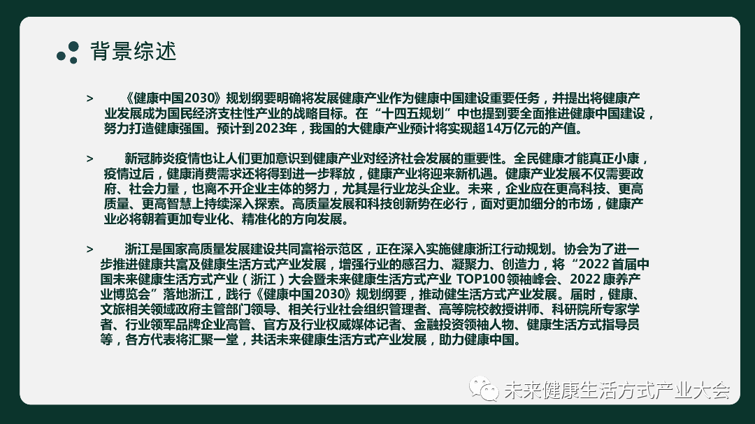 根据“全国卫生产业企业管理协会健康生活方式产业分会”卫企管协健康分会字〔2022〕023号通知(附件1)精神,“2022 首届中国未来健康生活方式产业(浙江)大会暨未来健康生活方式产业TOP100领袖峰会”落地浙江嘉兴,践行《健康中国2030》规划纲要,推动健康生活方式产业发展。 在“健康中国”的大战略背景下,大健康产业的市场规模近年来呈量级增长的状态。国家统计局数据显示,到2023年,我国的大健康产业预计将实现超14万亿元的产值。