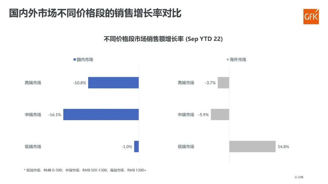 从不同价格段的市场来看,在国内市场中,中高端市场的销售额以两位数的速度同比下滑,低端市场也呈下跌趋势。而在海外市场中,中高端市场同样萎缩,但速度较国内市场缓慢,而低端市场则呈现双位数的快速同比增长。