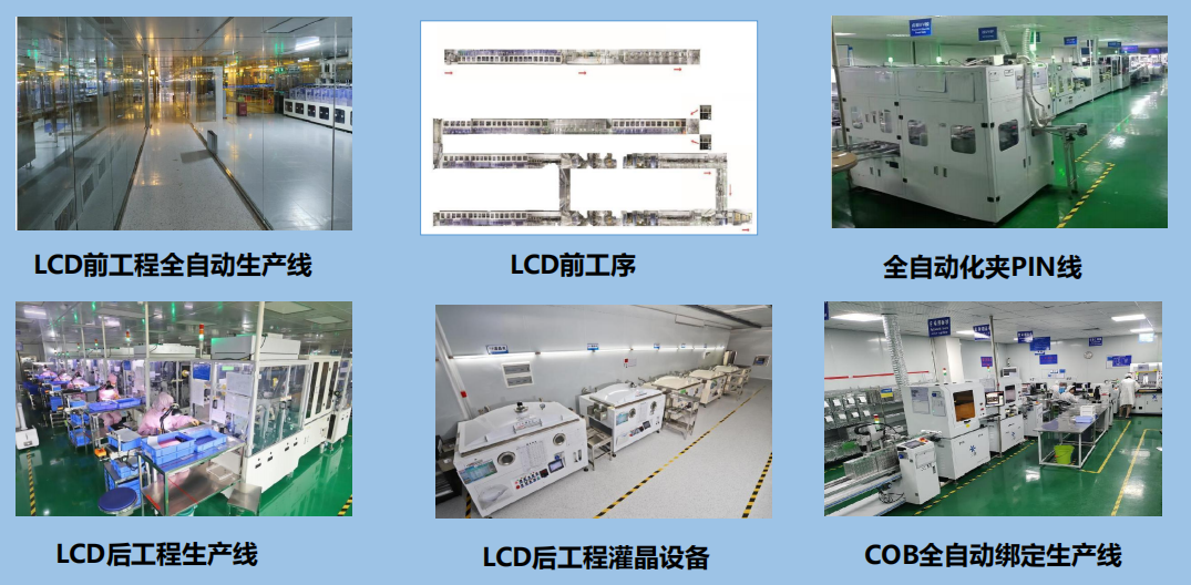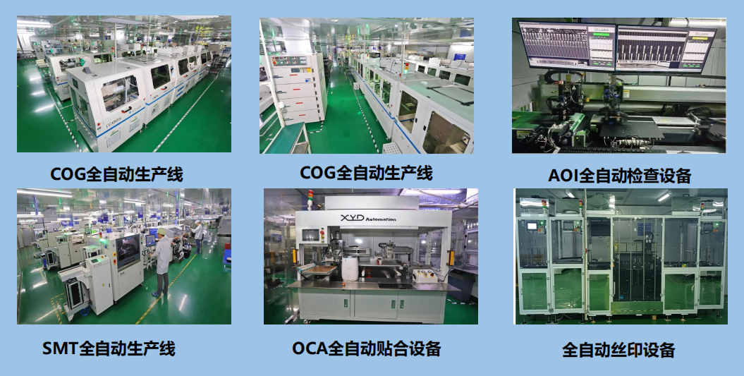 公司拥有Mono-LCD、COG、COB、OCA贴合、SMT、OEM加工、LED背