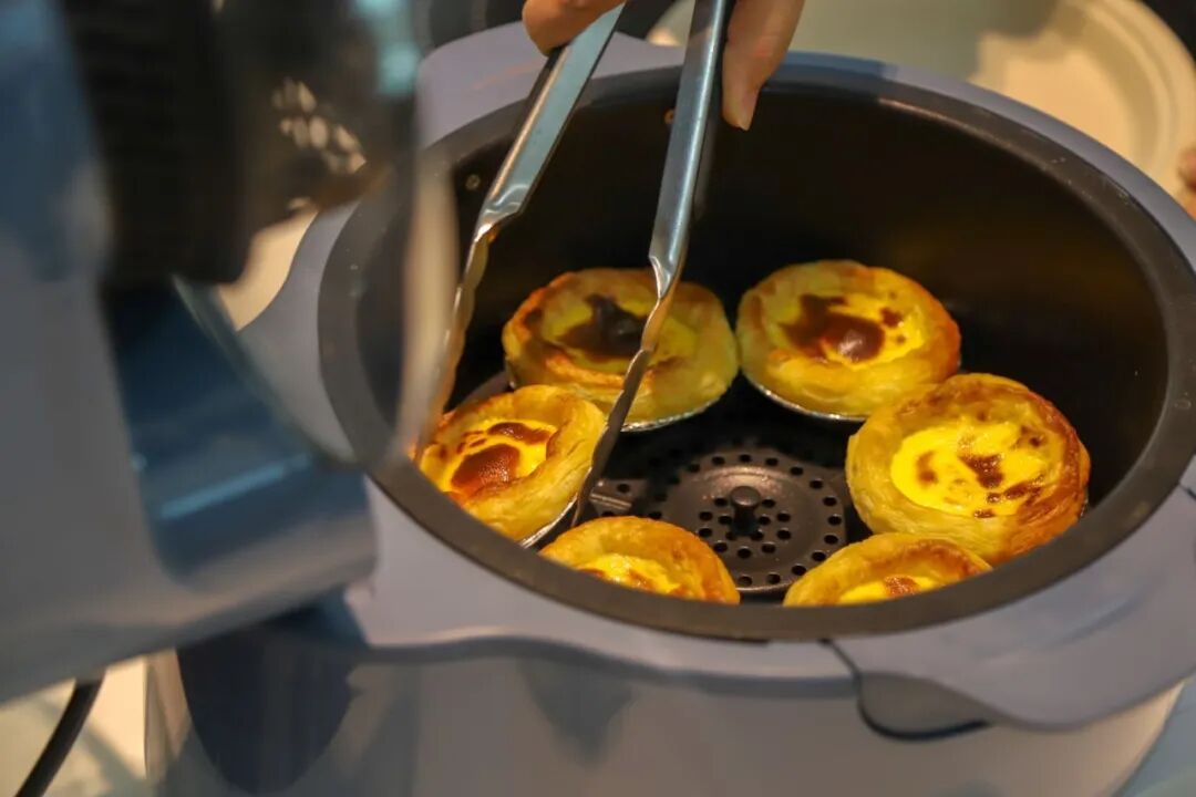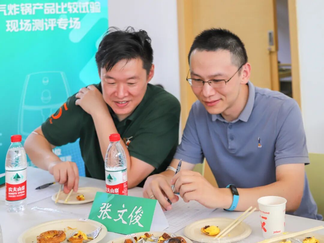 评测会现场,专家和消费代表一边品鉴由空气炸锅现场制作的蛋挞、薯条和鸡翅,一边热烈讨论,并对食物熟度、色泽、味道、口感等方面进行打分。