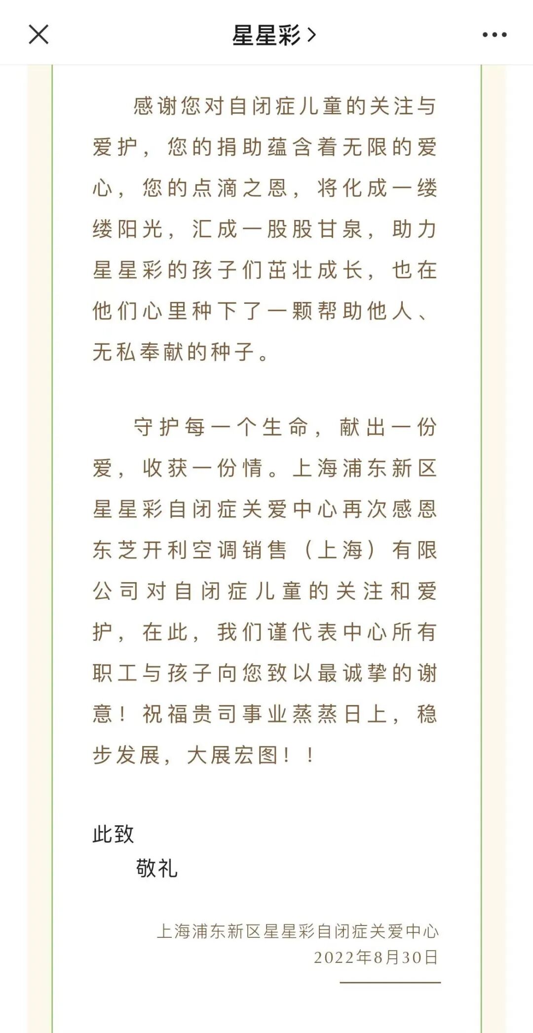 烈日炎炎,酷暑难当。在得知炎热天气或会导致自闭症儿童情绪不稳定、烦躁易怒,更有甚者会有异常伤他或自伤行为时,为了能让孩子们拥有更好的学习、康复环境,东芝空调携手上海泽天,迅速联系到星星彩院长黄文力女士,表达了想为孩子们做实事的意愿,并顺利发起空调捐赠事宜。