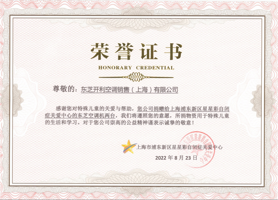 安装当晚,星星彩黄院长为东芝空调颁发荣誉证书,并感谢东芝空调对星星彩的关心和厚爱,以及对自闭症儿童教育事业的帮助和支持。