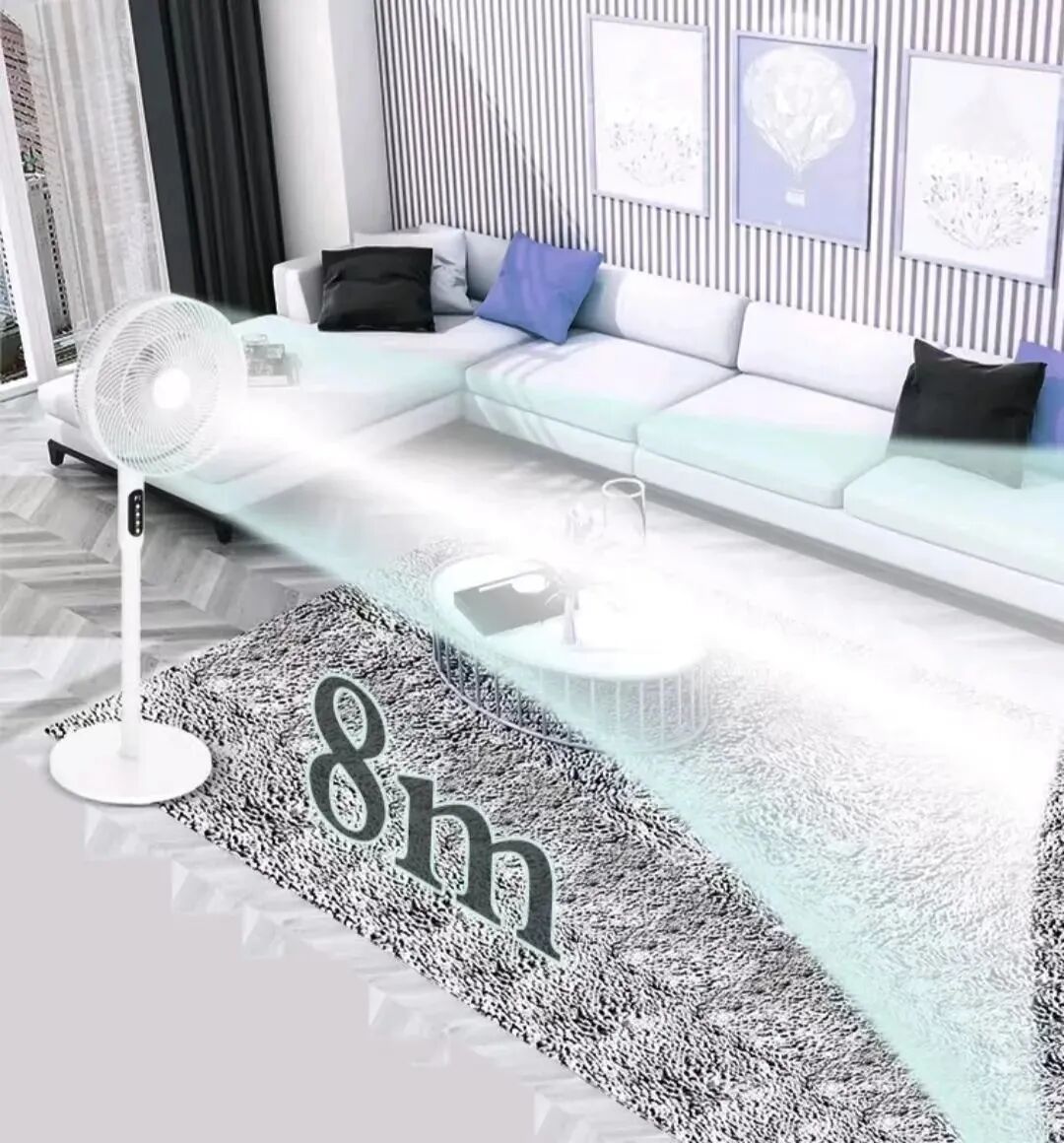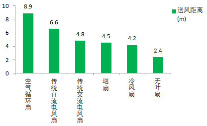 送风距离是测试电风扇能将风吹的有多远,空气循环扇毋庸置疑排名第一,它的设计就是为了更快的循环空气,通过高风速定向送风距离最远,而无叶风扇则较差。塔扇和冷风扇没有传统风叶,送风距离也一般。