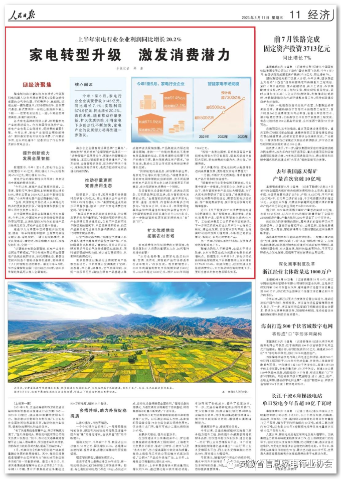 8月11日,人民日报经济版刊发轻工家电行业最新消息,报道指出,今年1至6月,家电行业企业实现营收9145亿元,同比增长7.1%;实现利润674.9亿元,同比增长20.2%。家电行业是建设轻工强国的重要领军力量,中国轻工业联合会高度重视家电行业高质量发展,张崇和会长指出:“家电行业要以高水平科技创新、高质量三品行动、先进性标准引领、数字化转型升级、低碳化绿色发展、高技能人才支撑等‘六要素’推动‘世界家电强国’建设。”近年来,家电行业坚持围绕六要素建设,持续提升行业竞争力,高质量发展取得显著成效,成为引领经济稳增长的重要支撑。本期报道以《上半年家电行业企业利润同比增长20.2%——家电转型升级 激发消费潜力》为题,详情如下。