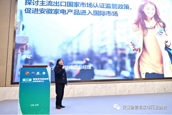 会议最后举行专题讲座,天祥集团电子电器华南区总经理李琼女士以《探讨主流出口国家市场认证监管政策、促进安徽家电进入国际市场》为主题作出报告。李总的报告详实探讨了家电出口各国家的市场认证监管政策,帮助家电企业进入国际市场提供了市场途径方法,为企业扩大出口奠定了基础。