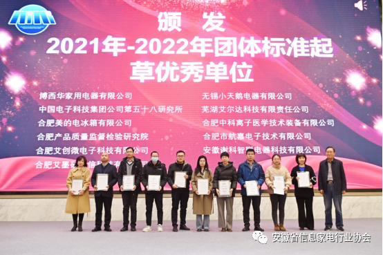 安徽省信息家电行业协会副秘书长刘杰发布了《冰箱铝制翅片蒸发器及回气管防腐蚀能力试验方法》等七项团体标准。上述标准是由合肥美的电冰箱有限公司、芜湖艾尔达科技有限责任公司、无锡小天鹅电器有限公司、合肥中科离子医学技术装备有限公司、合肥产品质量监督检验研究院、合肥市航嘉电子技术有限公司等单位起草并经过规定的程序获得批准。