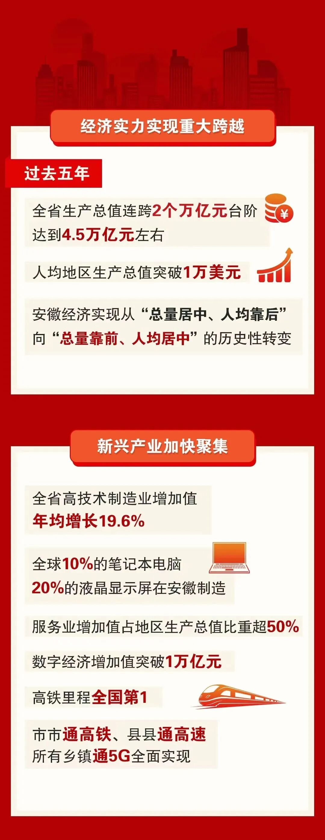 过去5年,安徽经济实力实现重大跨越,全省生产总值连跨2个万亿元台阶、达到4.5万亿元左右,人均地区生产总值突破1万美元。粮食产量稳定在800亿斤以上,跃升到全国第4位。社会消费品零售总额突破2万亿元,进出口总额突破1千亿美元。安徽经济实现从“总量居中、人均靠后”向“总量靠前、人均居中”的历史性转变。