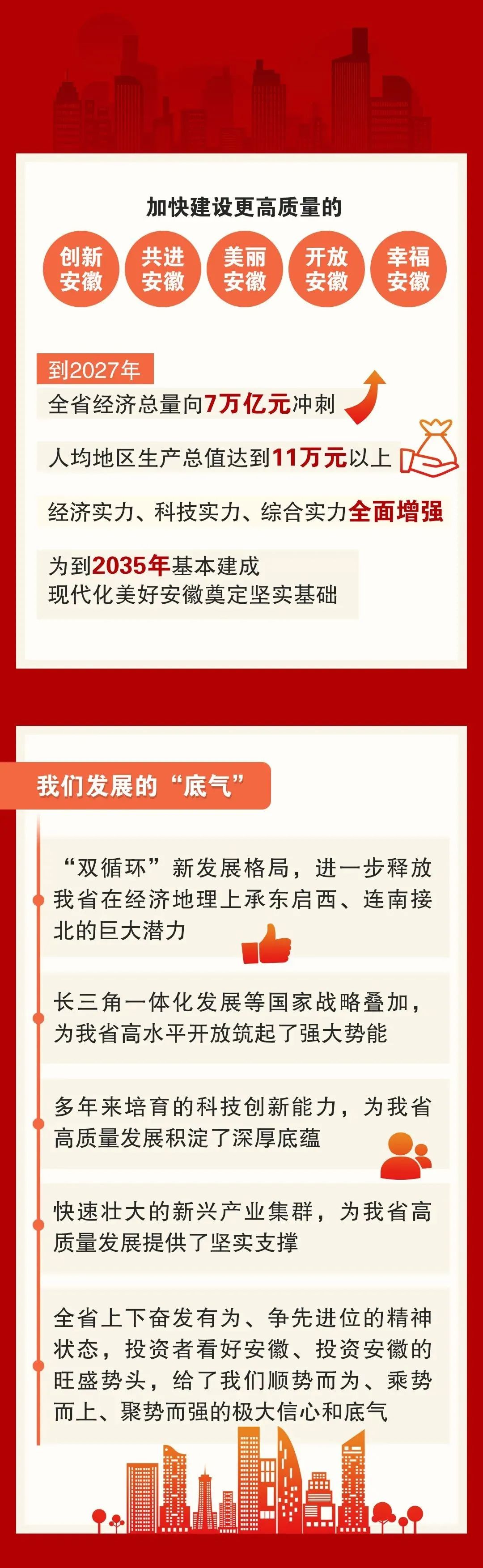 科技创新策源地建设实现重大突破。新兴产业聚集地建设取得重大进展。改革开放新高地建设迈出重大步伐。经济社会发展全面绿色转型区建设取得重大成效。合肥综合性国家科学中心启动建设,全国首个国家实验室落户安徽,已建在建拟建大科学装置12个。量子通信、量子计算、核聚变等领域原创成果世界领先,动态存储芯片、制版光刻设备、制造EDA软件等突破关键核心技术,区域创新能力从全国第10位跃升至第7位。全省高技术制造业增加值年均增长19.6%,全球10%的笔记本电脑、20%的液晶显示屏在安徽制造。服务业增加值占地区生产总值比重超50%,数字经济增加值突破1万亿元。寄托安徽人民千百年梦想的引江济淮工程通水通航。高铁里程全国第1,市市通高铁、县县通高速、所有乡镇通5G全面实现。2022年,安徽打出招商引资、招才引智新攻势。落实季末工作会议和季首重大项目开工制度,深化投资“赛马”、“管行业必须管投资”、多部门常态化要素会商等机制,全方位大抓投资的工作格局进一步形成。坚持把招商引资、招才引智作为投资工作主抓手,建立覆盖十大新兴产业的主题基金和商协会,基本建成市场化、专业化招商力量体系,形成产业链招商主形态,推出场景招商新模式。通过招商引资,新开工50亿元以上制造业项目56个、比上年增加51个,其中百亿元以上制造业项目10个、比上年增加8个。科技创新势能加快向发展动能转化。全社会研发投入强度2.5%左右,每万人口有效发明专利拥有量23.7件。科技成果转化成效显著,吸纳技术合同成交额增长40%左右。为打造科技体制改革“试验田”,推动科创与产业融合发展,“科大硅谷”启动运行。为培养“懂科技、懂产业、懂资本、懂市场、懂管理”的复合型科技产业组织人才,中国科大科技商学院挂牌成立。企业科技创新主体地位得到加强,净增国家级高新技术企业3900家左右,新增国家企业技术中心4家。滁州、安庆高新区升级为国家级高新区。人才队伍持续加强,115人入选国家级人才计划,新增高技能人才12.8万人。以国内大循环为主体、国内国际双循环相互促进的新发展格局,进一步释放安徽在经济地理上承东启西、连南接北的巨大潜力;长三角一体化发展等国家战略叠加,为安徽高水平开放筑起了强大势能;多年来培育的科技创新能力,为安徽高质量发展积淀了深厚底蕴;快速壮大的新兴产业集群,为安徽高质量发展提供了坚实支撑;全省上下奋发有为、争先进位的精神状态,投资者看好安徽、投资安徽的旺盛势头,给了我们顺势而为、乘势而上、聚势而强的极大信心和底气。到2027年,全省经济总量向7万亿元冲刺,人均地区生产总值达到11万元以上,经济实力、科技实力、综合实力全面增强,为到2035年基本建成现代化美好安徽奠定坚实基础。开辟发展新领域新赛道,塑造发展新动能新优势,创新安徽建设取得新突破。