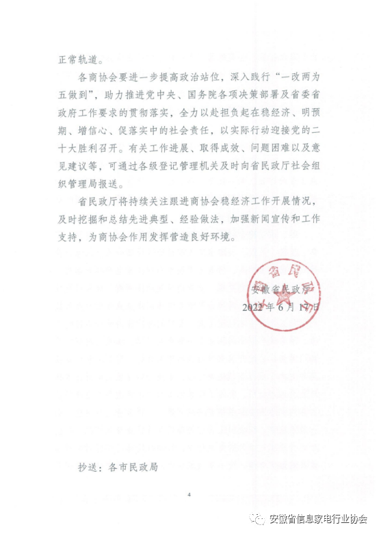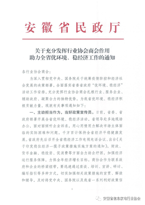 日前,安徽省民政厅印发《关于充分发挥行业协会商会作用助力全省优环境、稳经济工作的...