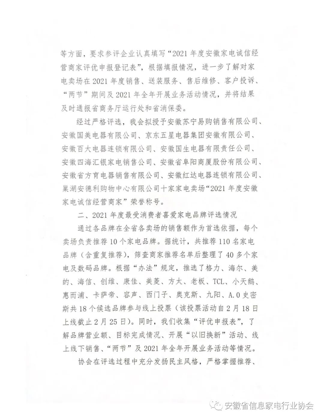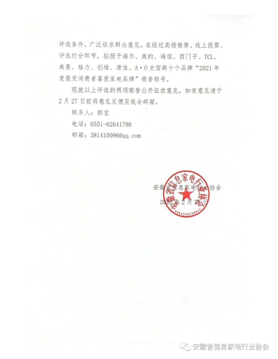【重要通知】关于征询2021年度安徽家电“诚信商家”“消费者喜爱品牌”评选结果意见的函