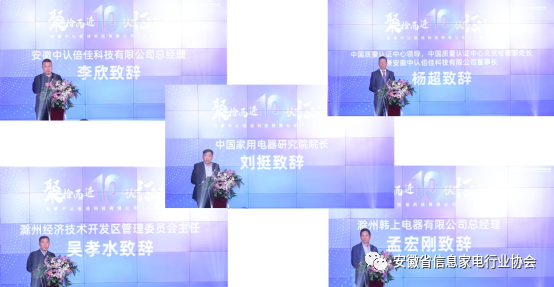 参加此次盛会的股东方及公司领导有:中国家用电器研究院院长刘挺、中国质量认证中心处长/安徽中认倍佳科技有限公司董事长杨超、中国家用电器研究院安徽分院院长/安徽中家智锐科技有限公司总经理张涛、中国家用电器研究院检测所副所长/安徽中认倍佳科技有限公司总经理李欣;