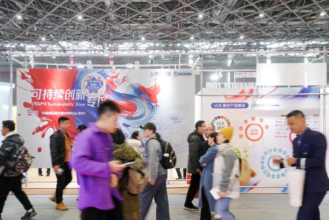 可持续创新专区中,入选《2023可持续时尚践行者名录》的16家在绿色制造、环境友好、负责任投资、循环经济等可持续时尚取得杰出成就的优秀企业的代表性产品在此集中。太平鸟圆领针织卫衣、森马针织裤、Miss Sixty/九牧王x前进牛仔裤、七匹狼男装牛仔茄克、伊芙丽天丝TM莱赛尔混抗菌涤纶西装、爱慕&爱慕先生睡眠衣、BHF博恒再生原液着色涤纶T恤、有棵树男士内裤等参与碳足迹测评的产品,观众们都可以现场扫描二维码获取报告详情。现场还设立“循碳记”打卡活动专区,观众进入循碳记小程序并完成各路线的打卡任务并发送朋友圈,即可兑换相应奖项,而奖品中的吊旗再生包袋则来源于2023年中国纺联秋季联展总面积约5100平方米、重达3吨左右的吊旗,更是展现了CHIC将可持续行动落到实处的价值理念。
