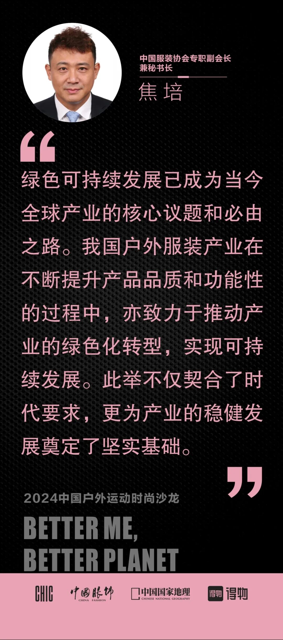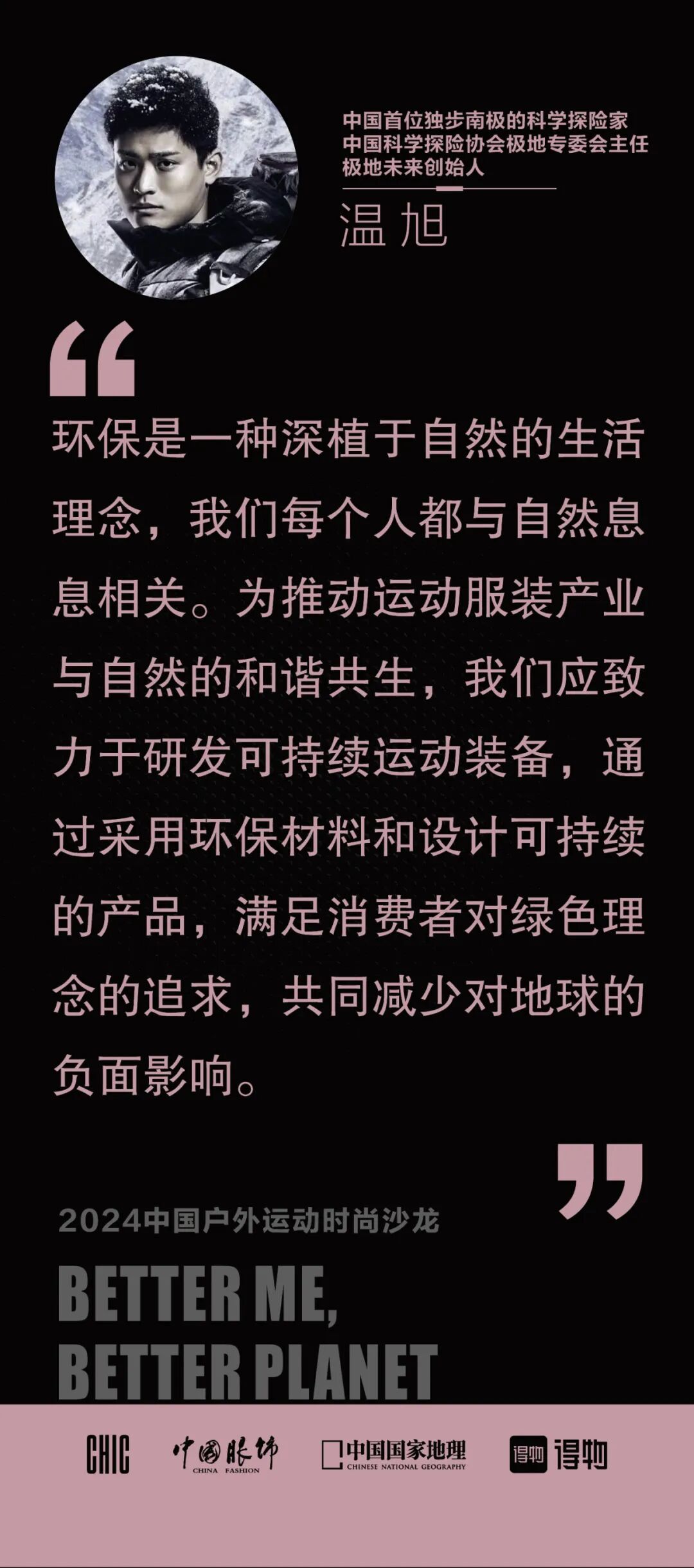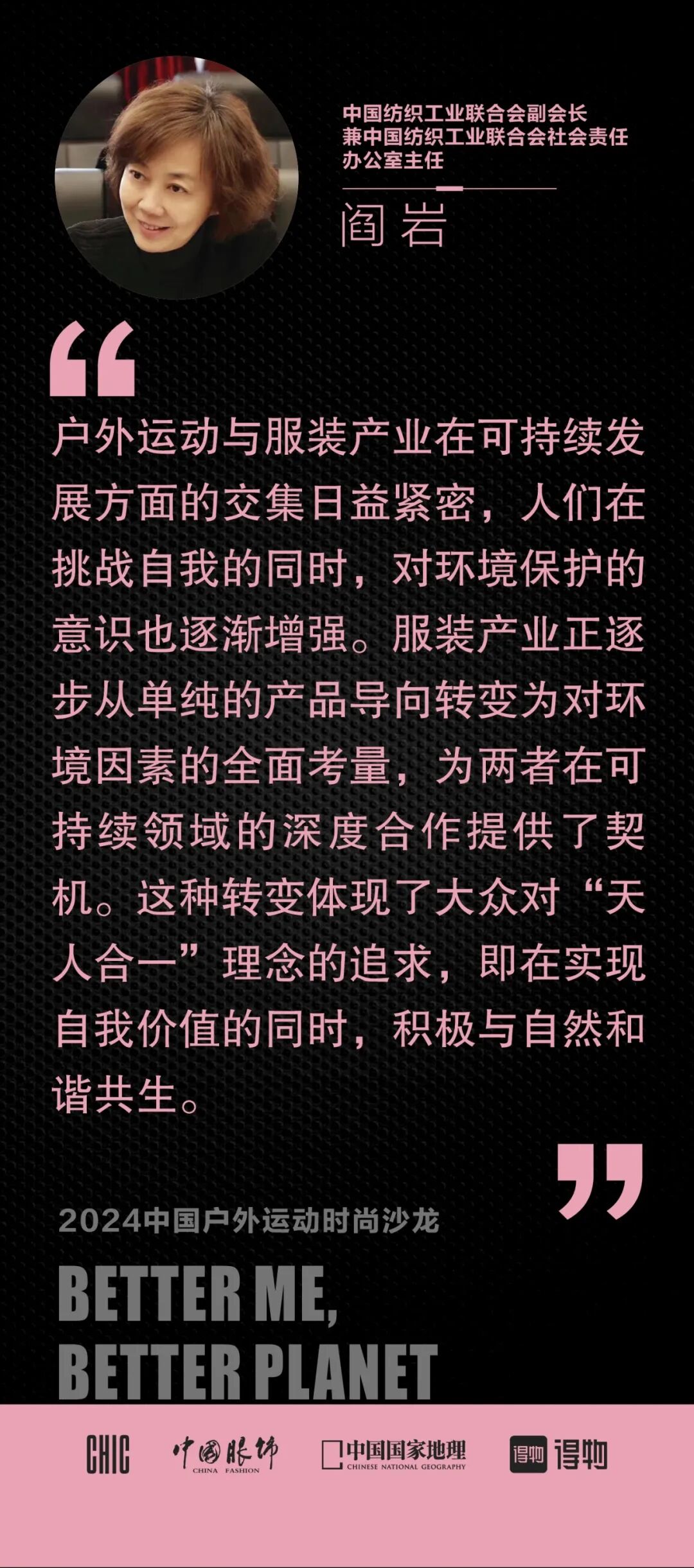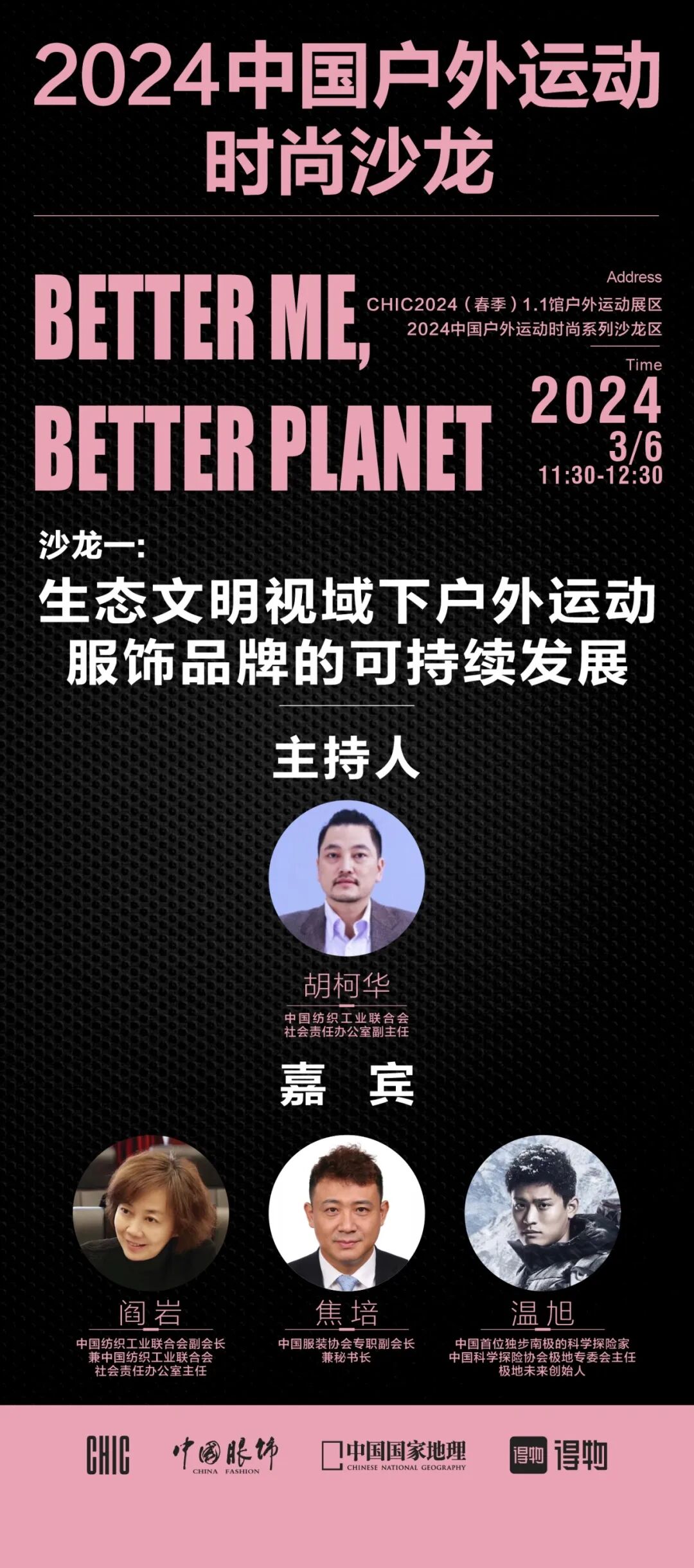 3月6日,2024中国户外运动时尚沙龙于CHIC2024(春季)1.1馆户外运动展区系列沙龙区隆重启幕,聚集中国纺织工业联合会副会长兼中国纺织工业联合会社会责任办公室主任阎岩,中国服装协会专职副会长兼秘书长焦培,中国首位独步南极的科学探险家、中国科学探险协会极地专委会主任、极地未来创始人温旭,得物平台头部达人不潮徐老师、中国十佳设计师葛凤等众多专业领域内重磅嘉宾及KOL,为在场观众带来“生态文明视域下户外运动服饰品牌的可持续发展”“Z世代的新潮运动偏好,隐藏的品牌内容营销密码”“基于都市生活方式的(女性)户外运动服饰需求分析”三场精彩的沙龙分享,以下为嘉宾分享精华选编,让我们一起来看:
