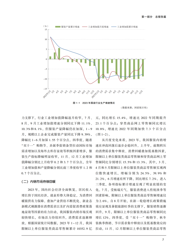 2023年是极不平凡的一年,也是拼搏奋斗的一年。《2023-2024中国服装行业发展报告》以详实的数据、准确的分析、前瞻性的研判,向读者全面展示了2023年中国服装行业发展环境和现状。报告分为总报告篇、分报告篇、产业链报告篇、专题篇、观点篇、大事记篇,以及包含“2023年中国服装行业运行数据集总”等行业信息的附录篇,共计七部分内容,为服装企业和相关业界人士提供具有指导性和权威性的参考依据。总报告篇主要是《2023-2024年中国服装行业经济运行发展报告》,该报告认真总结分析了2023年中国服装产业生产、市场、投资情况,深入分析影响行业发展主要因素以及行业运行特点,并就2024年中国服装行业发展趋势进行了前瞻性预测。