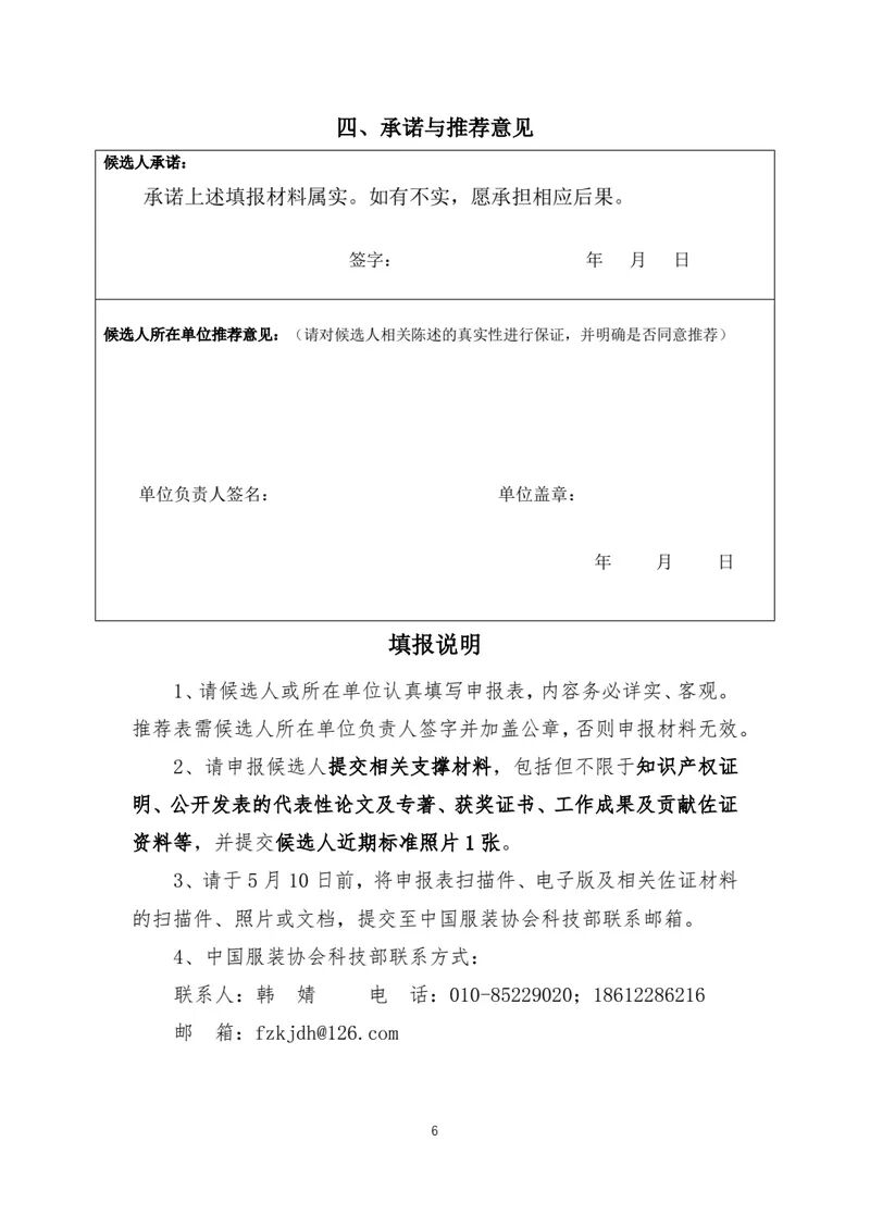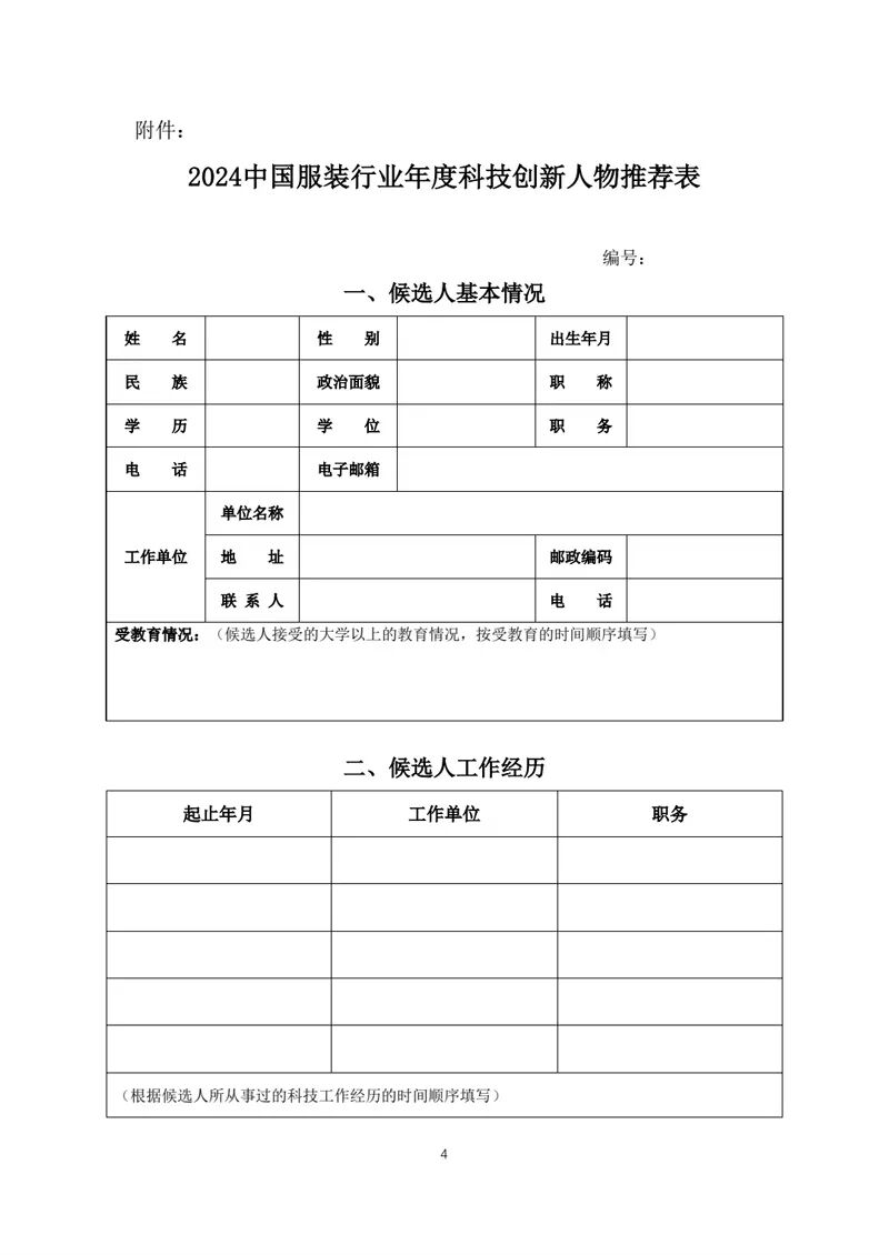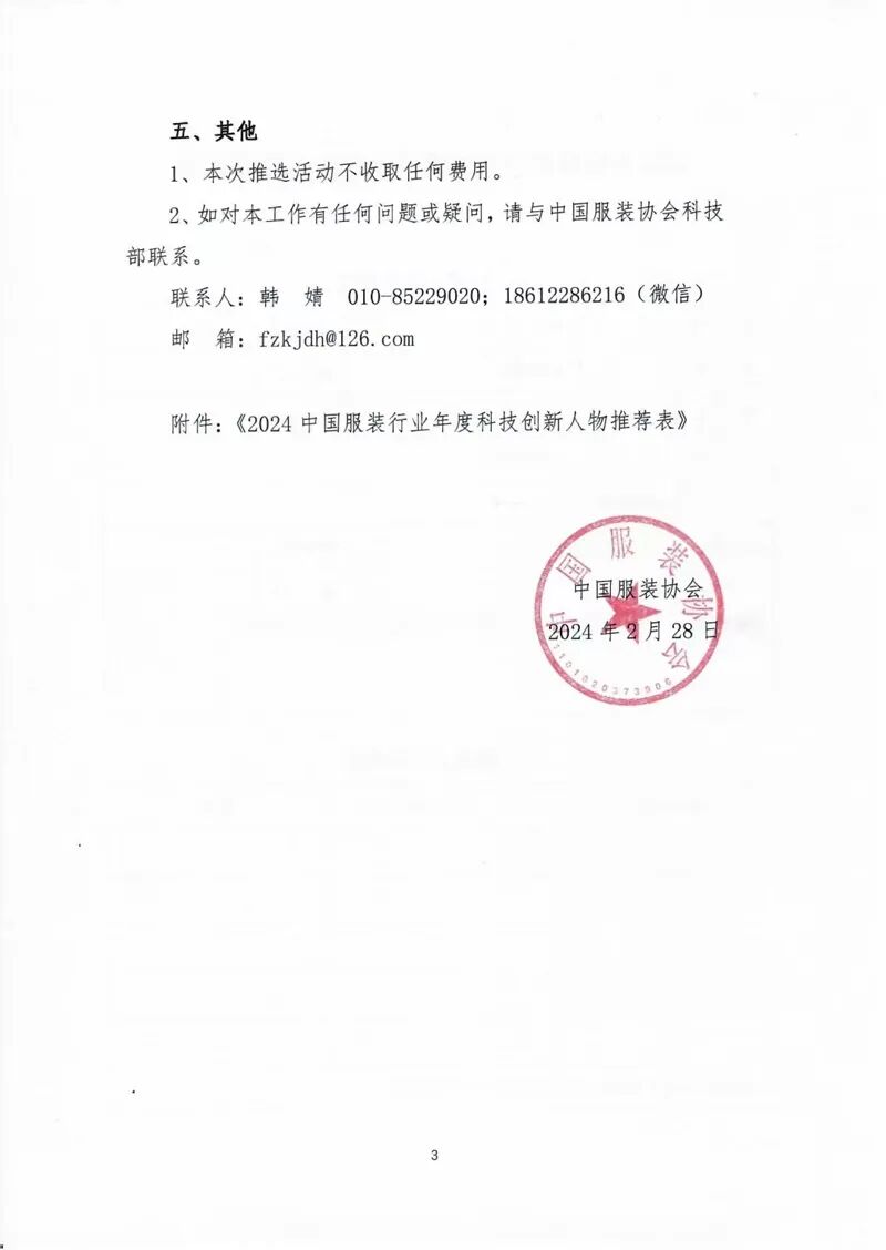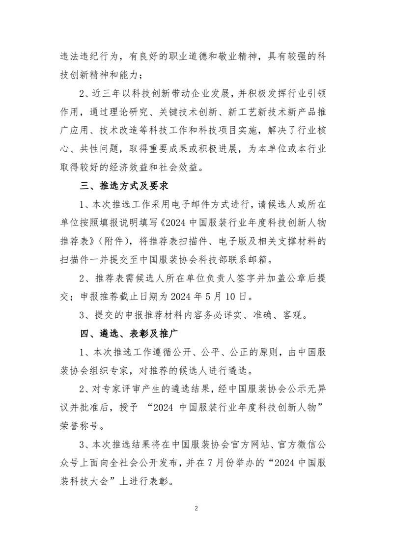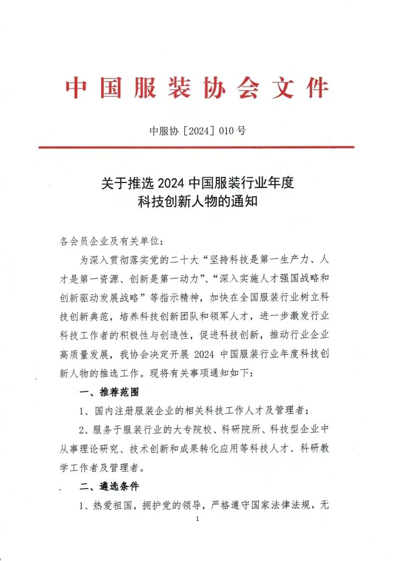 为深入贯彻落实党的二十大“坚持科技是第一生产力、人才是第一资源、创新是第一动力”、“深入实施人才强国战略和创新驱动发展战略”等指示精神,加快在全国服装行业树立科技创新典范,培养科技创新团队和领军人才,进一步激发行业科技工作者的积极性与创造性,促进科技创新,推动行业企业高质量发展,我协会决定开展2024中国服装行业年度科技创新人物的推选工作。现将有关事项通知如下:2、服务于服装行业的大专院校、科研院所、科技型企业中从事理论研究、技术创新和成果转化应用等科技人才、科研教学工作者及管理者。1、热爱祖国,拥护党的领导,严格遵守国家法律法规,无违法违纪行为,有良好的职业道德和敬业精神,具有较强的科技创新精神和能力;2、近三年以科技创新带动企业发展,并积极发挥行业引领作用,通过理论研究、关键技术创新、新工艺新技术新产品推广应用、技术改造等科技工作和科技项目实施,解决了行业核心、共性问题,取得重要成果或积极进展,为本单位或本行业取得较好的经济效益和社会效益。1、本次推选工作采用电子邮件方式进行,请候选人或所在单位按照填报说明填写《2024中国服装行业年度科技创新人物推荐表》(附件),将推荐表扫描件、电子版及相关支撑材料的扫描件一并提交至中国服装协会科技部联系邮箱。2、推荐表需候选人所在单位负责人签字并加盖公章后提交;申报推荐截止日期为2024年5月10日。1、本次推选工作遵循公开、公平、公正的原则,由中国服装协会组织专家,对推荐的候选人进行遴选。2、对专家评审产生的遴选结果,经中国服装协会公示无异议并批准后,授予 “2024中国服装行业年度科技创新人物”荣誉称号。3、本次推选结果将在中国服装协会官方网站、官方微信公众号上面向全社会公开发布,并在7月份举办的“2024中国服装科技大会”上进行表彰。2、如对本工作有任何问题或疑问,请与中国服装协会科技部联系。韩 婧 010-85229020;18612286216(微信)附 件:《2024中国服装行业年度科技创新人物推荐表》