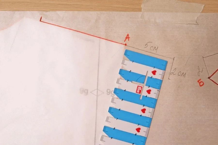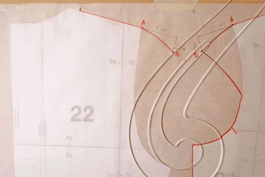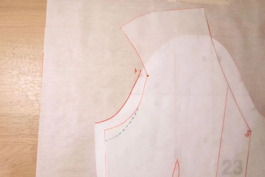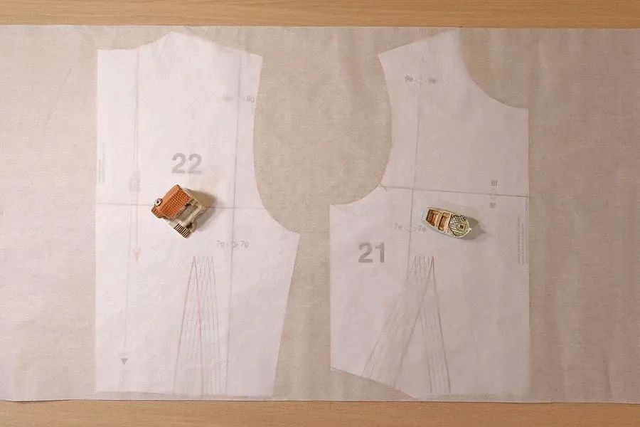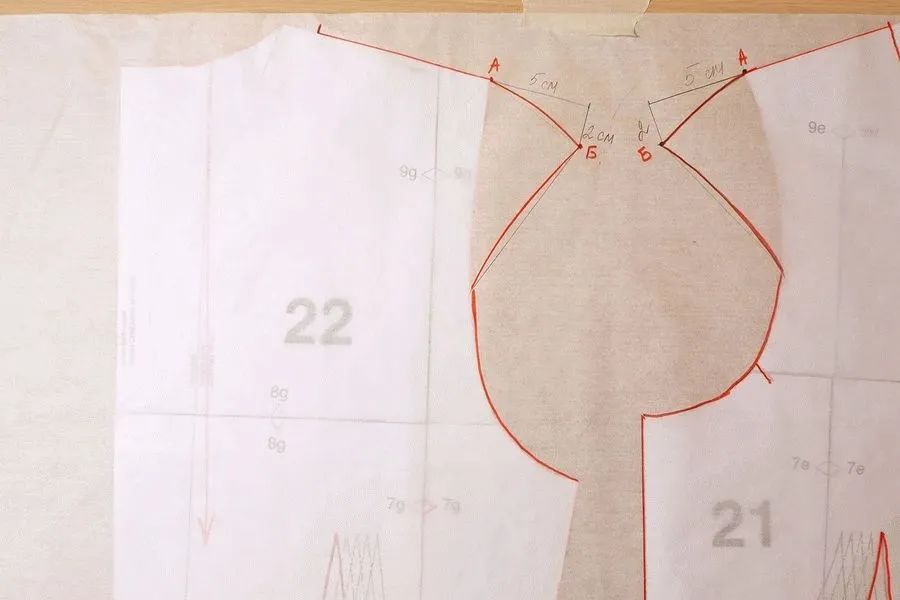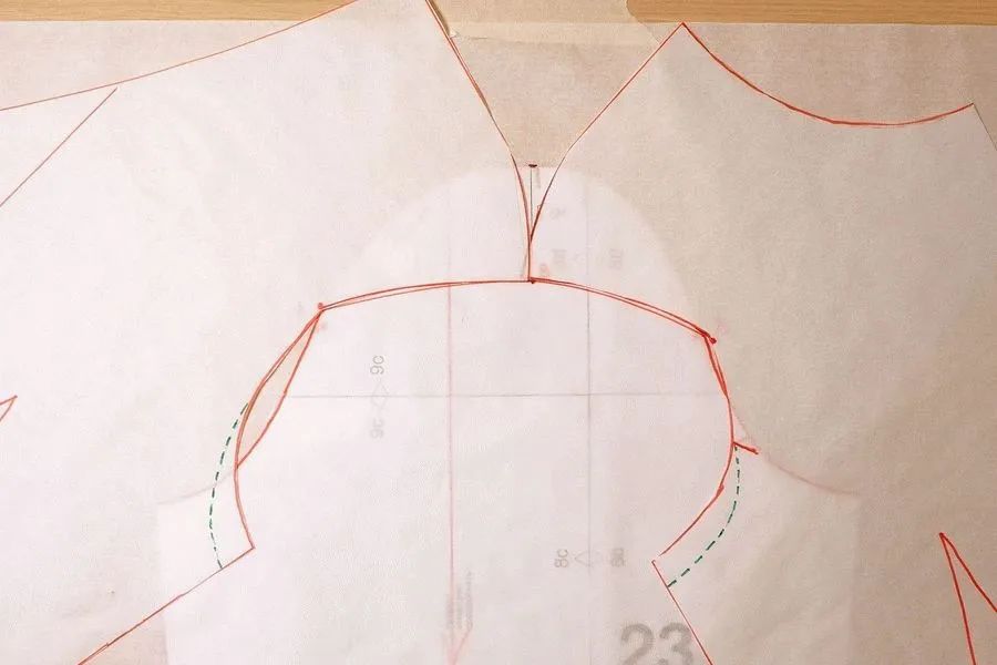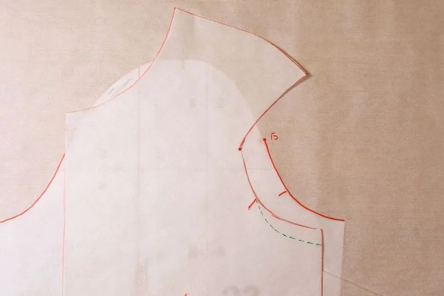 在本节中,我们将学习如何来模拟这款上衣的造型,其中袖子的造型是重点,也是难点,不啰嗦,直接开始。作为造型的基础,我选择了Burda杂志11/2012的121号紧身衣的连衣裙图案。在进行模拟之前,你需要准备衣身的基本原型:打印后对图形进行必要的调整并剪切图案。1、用复写纸覆盖在衣身的原型上,然后用重物或胶带固定。2、从颈部开始。如果有必要调整其宽度,那么我们沿着肩线撤回所需的值。我决定将颈部扩大2厘米。