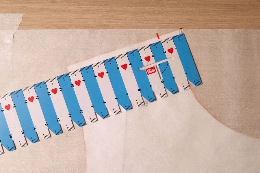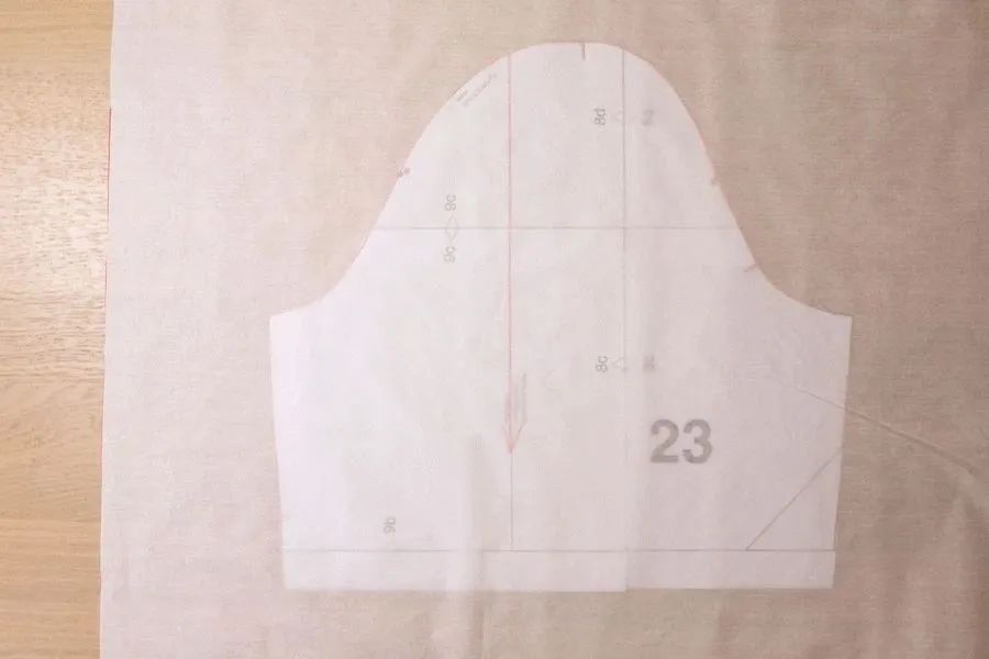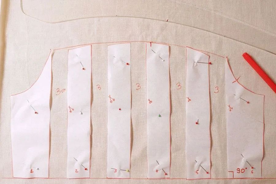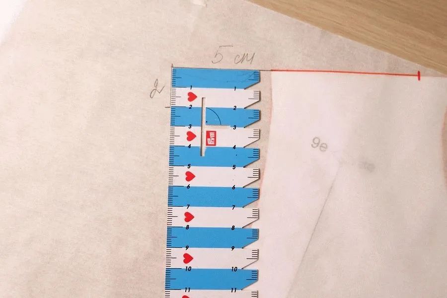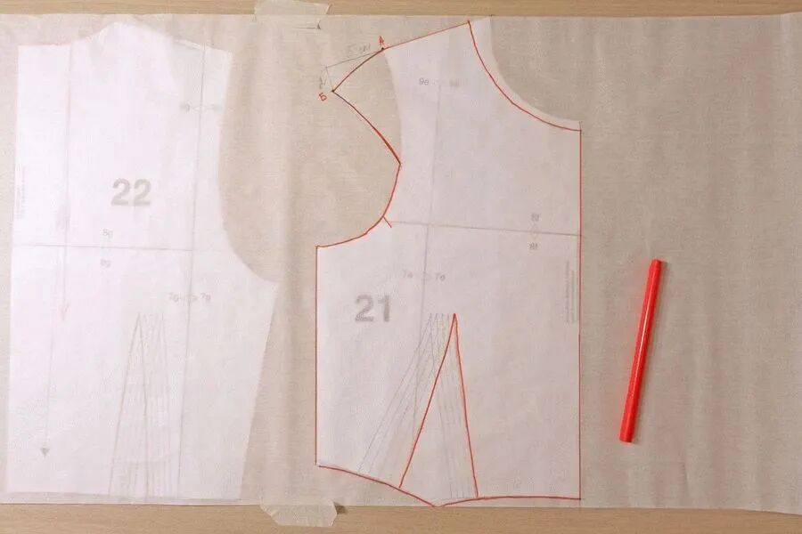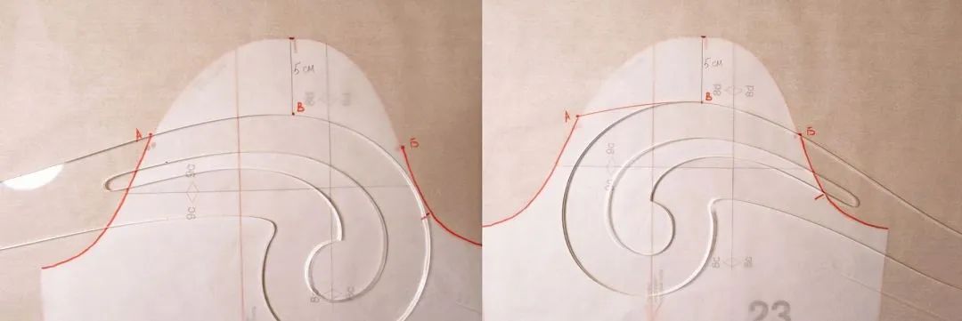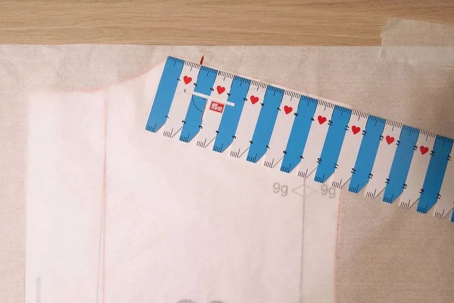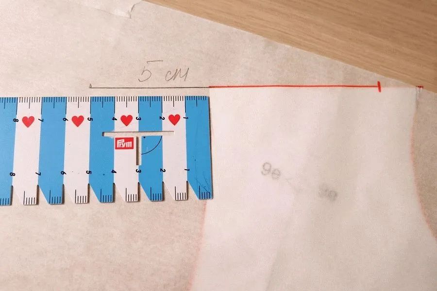 在本节中,我们将学习如何来模拟这款上衣的造型,其中袖子的造型是重点,也是难点,不啰嗦,直接开始。作为造型的基础,我选择了Burda杂志11/2012的121号紧身衣的连衣裙图案。在进行模拟之前,你需要准备衣身的基本原型:打印后对图形进行必要的调整并剪切图案。1、用复写纸覆盖在衣身的原型上,然后用重物或胶带固定。2、从颈部开始。如果有必要调整其宽度,那么我们沿着肩线撤回所需的值。我决定将颈部扩大2厘米。