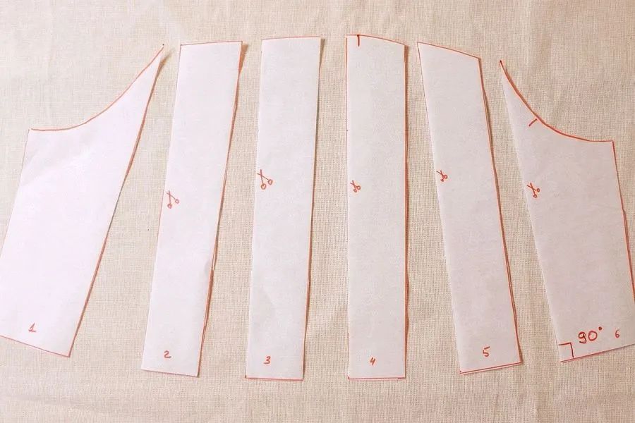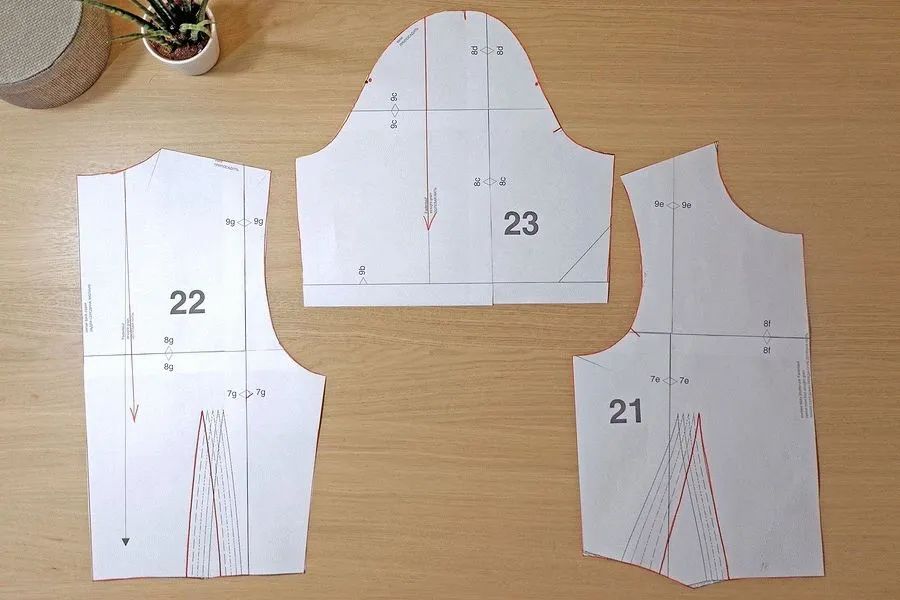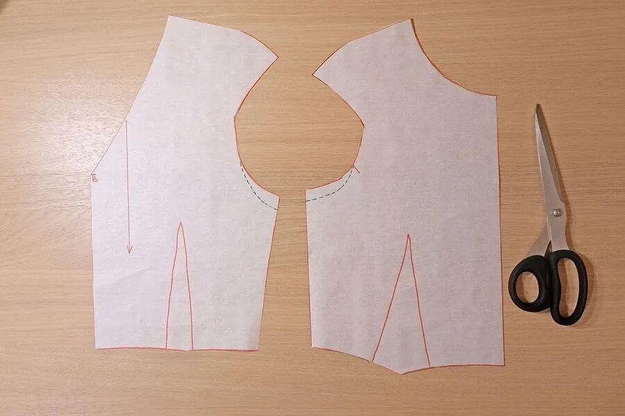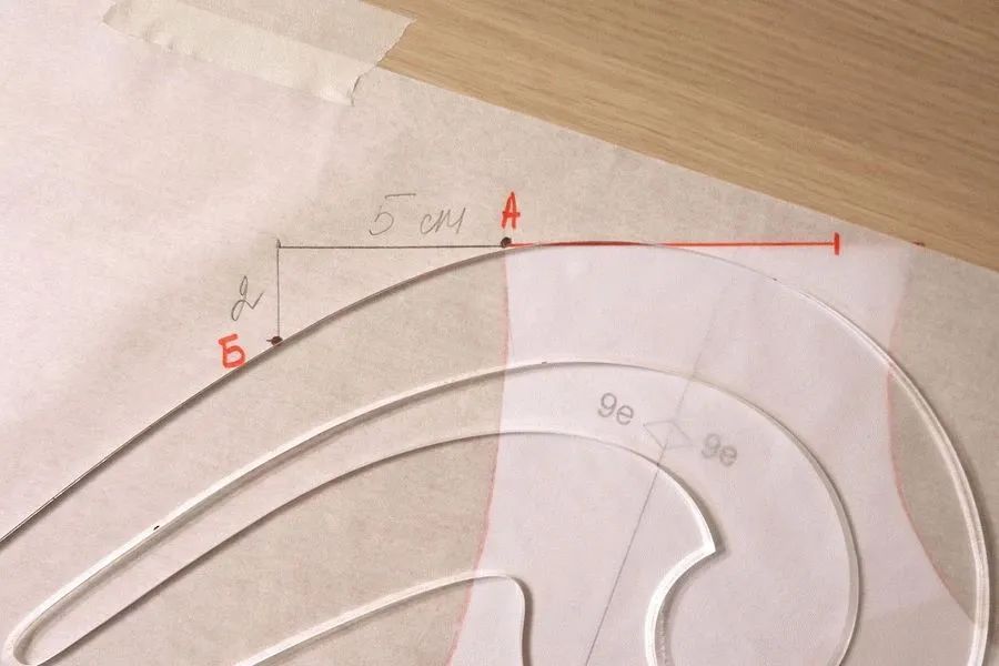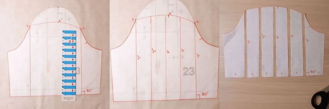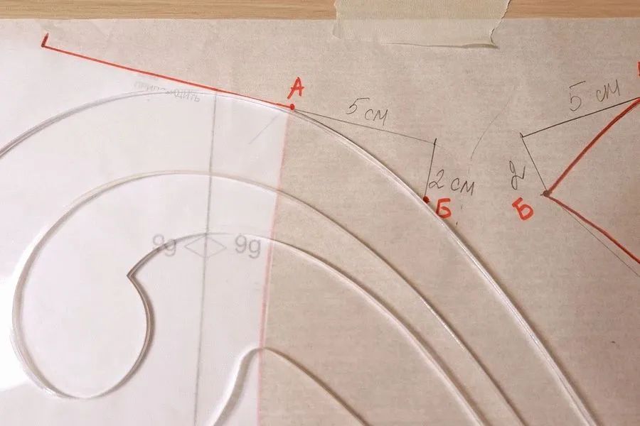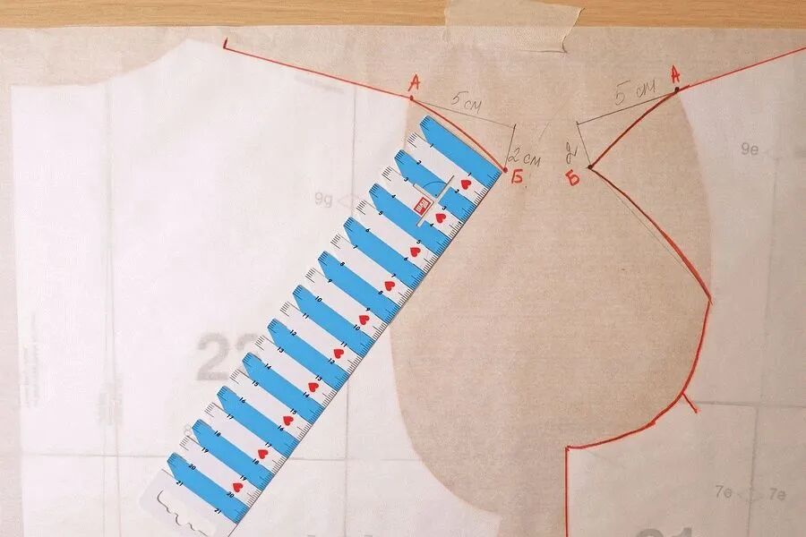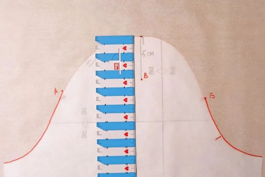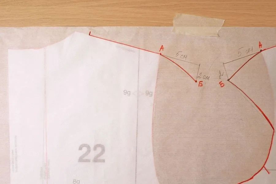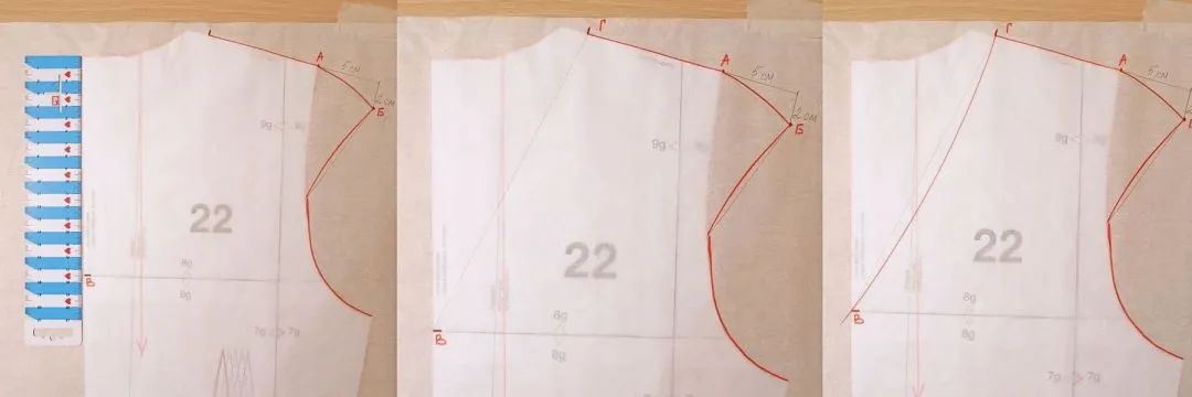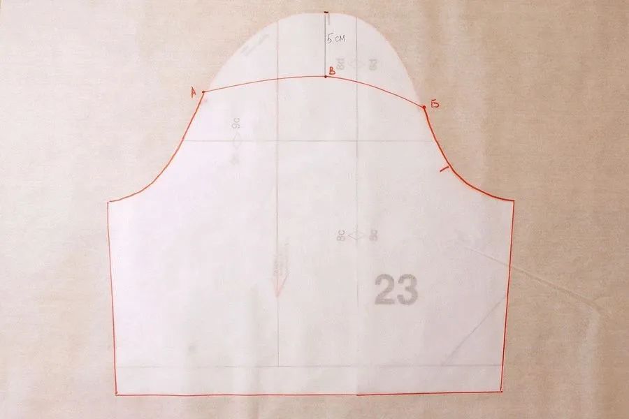 5、我们在图中注意到两点:旧肩线的末端是A点,新肩线的末端是B点。用直线连接点A和B,然后用曲线用曲线绘制它。6、从B点开始,降低与新肩线的垂线,使其紧靠袖孔。让我们用凹线绘制得到的线段。7、让我们继续模拟后片。从肩部的颈部,向下移动2厘米,以增加颈围。10、在图中我们注意到两点:旧肩线的末端是A点,新肩线的末端是B点。用直线连接点A和B,然后用曲线用曲线绘制它。11、从B点开始,降低与新肩线的垂线,使其紧靠袖孔。让我们用凹线绘制得到的线段。袖孔的其余部分的位置对应于原始图。我决定在背面做一个浅三角领口。为此,我在背面的中央放下选定的切口深度--17.5厘米,B点。我将A点和B点连接成一条直线,并用一条略微凹陷的线条画出。13、如果在调整后,袖孔变短,则沿着紧身胸衣的侧缝将袖孔线(照片中的绿色虚线)降低1.5-2cm。15、我们将完成的后片放在套筒图案上,并将袖孔的长度与弯曲部分和套筒脊部背面的线条相关联。绘制到该点的轮廓线的长度,并且在图中对应于返回到弯曲的袖孔的长度。17、让我们将袖山的顶部向下5厘米(因为我们将肩线延长了5厘米) - B点。18、借助图案将点A和B,B和B与光滑的曲线连接起来。19、在套筒的图纸上,垂直于套筒底部绘制几条线,将套筒的图案分成几个垂直条纹。我们在垂直线上切割图案。20、在布料上,所产生的垂直细节必须以相等的距离分布,我将它们展开3厘米。