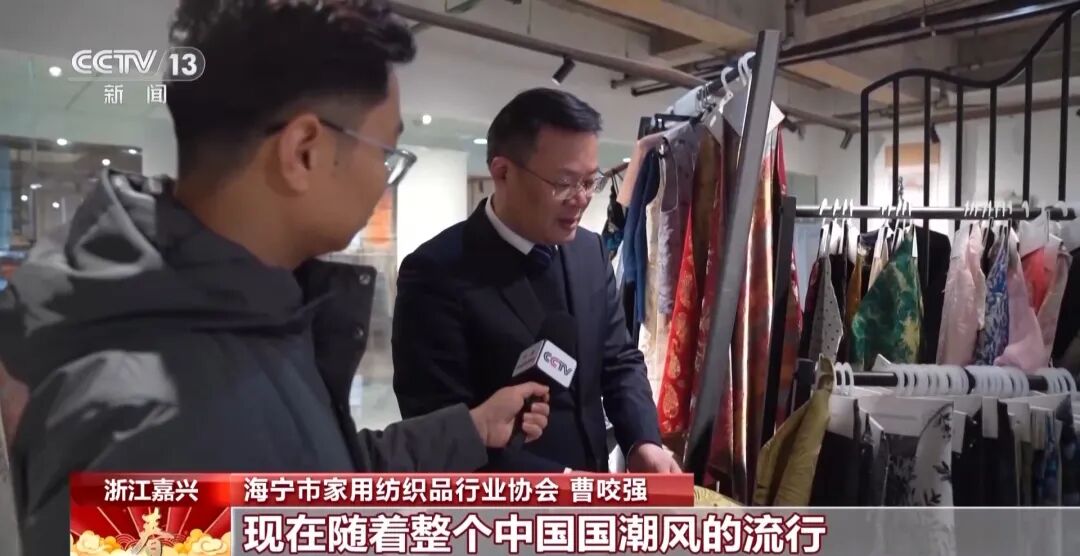 海宁市家用纺织品行业协会 曹咬强:这款面料主要是供应意大利市场,这个色系的面料主要供应美国市场。现在随着整个中国国潮风的流行,特别是在东南亚市场,他们每次下订单都是60万米、80万米。