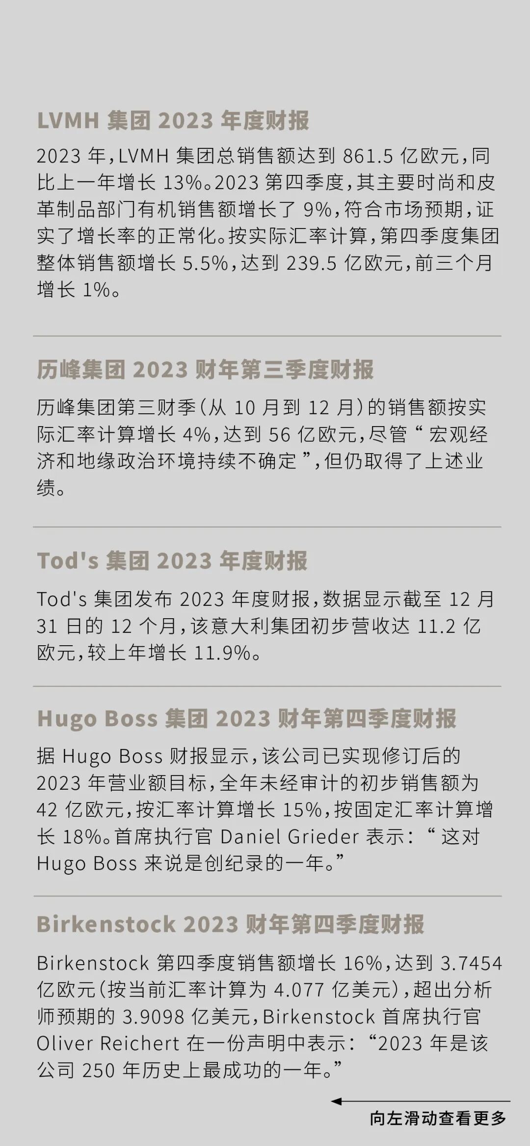 形势尚不明朗,正是追求稳妥行事的时候。当增速放缓成为全产业共同面临的现状,温和且健康的增长也随之成为共同的追求。在不确定性依然阴云笼罩的今天,奢侈品集团财报的披露在一定程度上为市场注入信心的同时,也给予了警醒。而掌舵者们透过财报所表达出的愿景,对应到 2024 的战略布局,或将给时尚产业留出沉淀的时间,以待厚积薄发。