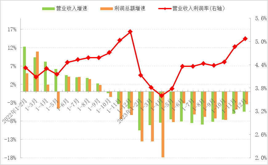 2023年,我国服装行业营业收入和利润总额的萎缩态势仍在延续,企业运行效率放缓,盈利难度加大,行业经济运行严重承压。根据国家统计局数据,2023年1-12月,我国服装行业规模以上(年主营业务收入2000万元及以上)企业13625家,实现营业收入12104.66亿元,同比下降5.40%,降幅比2022年加深0.84个百分点;利润总额613.82亿元,同比下降3.39%,降幅比2022年收窄2.95个百分点;营业收入利润率为5.07%,高于2022年0.11个百分点。受益于年末服装出口和内销的翘尾表现,行业效益指标明显改善,全年营业收入和利润总额降幅分别比前三季度收窄2.73和3.81个百分点,营业收入利润率比前三季度提高了0.69个百分点。