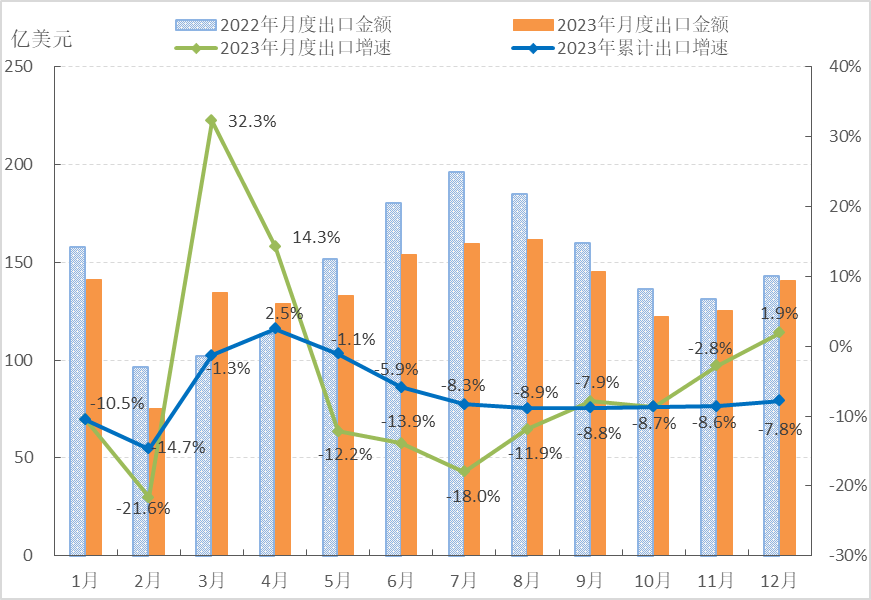 2023年,受国际市场需求收缩、“去中国化”趋势加剧等因素影响,我国服装出口延续了去年四季度增速放缓的态势,出口下行压力加大,出口规模明显下降。根据中国海关数据,2023年1-12月,我国累计完成服装及衣着附件出口1591.4亿美元,同比下降7.8%,增速比2022年同期放缓11个百分点。在圣诞节、新年等节日消费需求提升及美国去库存显效等因素作用下,年末两月服装出口明显向好,11月降幅收窄至2.8%,12月当月服装出口恢复正增长,同比增长1.9%,全年服装出口降幅比前三季度收窄1.0个百分点。从量价关系来看,服装出口量价齐跌,出口数量为304亿件,同比下降1.0%,出口平均单价4.32美元/件,同比下降6.9%。其中,针织服装及衣着附件出口金额825.7亿美元,同比下降7.8%,出口数量同比下降0.8%,出口单价同比下降7.5%;梭织服装及衣着附件出口金额704.2亿美元,同比下降6.8%,出口数量同比下降1.4%,出口单价同比下降6.0%。