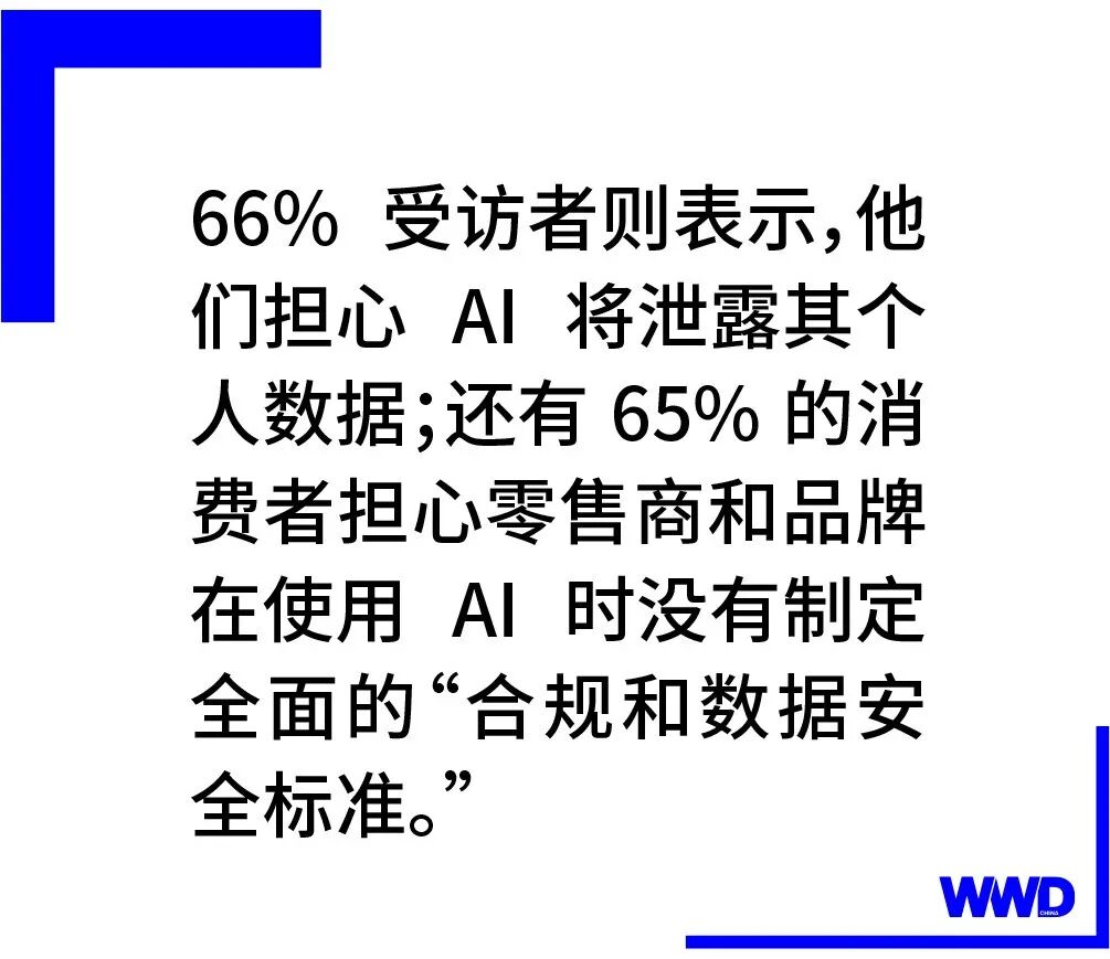 调查结果显示,受访者最希望在购物体验中应用 AI 的方式是推进促销活动(28%),而另外 23% 的受访者则希望通过 AI 获得购物奖励,相对而言,同比例的消费者更倾向于接收智能化产品推荐。显然,AI 技术的不断进步为消费者带来了更加便捷的购物体验,近 20% 的受访者表示,“AI 聊天机器人”和“虚拟助理”是他们购物体验中最具颠覆性的 AI 技术,但与此同时,市场仍然充斥着两极分化的评价,另有 20% 的消费者(接受调查)表示,与 AI 聊天机器人互动最有可能导致他们放弃已选购的商品。更值得一提的是,考虑到 2023 年并未完全成熟的 GenAI 技术,正以最快的速度被大众零售商采用,这不可避免地引起了消费者的警惕心理,不少消费者就信息安全方面,提出了对生成式 AI 技术的质疑,其中,44% 受访者表示,他们对在商业领域使用 AI 的品牌和零售商保持怀疑态度;66% 的受访者则表示,他们担心 AI 将泄露其个人数据;还有 65% 的消费者担心零售商和品牌在使用 AI 时没有制定全面的“合规和数据安全标准。”尽管如此,57% 的受访者表示,只要零售商对使用 AI 技术的细节保持公开透明,他们不介意在购物过程中使用 AI 辅助工具,尤其是千禧一代,这种支持情绪甚至高达 66%。Alexander Goncharuk 表示,“零售商推出和应用 AI 技术的关键在于提高技术使用的公开透明度,并将其融入到全渠道购物流程中,同时,需要建立强大且安全的信息合规流程。”中国服装科创研究院入选工信部2023年智能制造系统解决方案揭榜挂帅项目