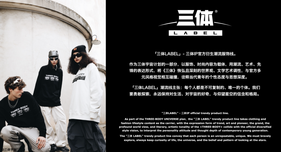 一千个读者心中,有一千个哈姆雷特。红岸基地、三体游戏、太空军舰队、水滴等《三体》中的众多经典场景及元素,都是三体迷心中的“光”。三体迷也希望看到更加多元丰富的对三体IP的演绎和阐释。如众多三体迷所愿,三体IP官方衍生潮流服饰线——三体LABEL应运而生,品牌以服饰、时尚内容为载体,用潮流、艺术、先锋的表达形式,将《三体》恢弘且深刻的世界观、文学艺术调性,与官方多元风格视觉相互交融,诠释当代青年的个性态度与思想深度,让潮流触手可及。三体宇宙时尚业务负责人透露,未来一段时间内三体LABEL将和小众先锋设计师、品牌、艺术家推出胶囊系列,特别是会在《三体》中的人文哲思和未来科技美学方面展开创想,《三体》故事将在他们的理解及创新中继续闪烁。