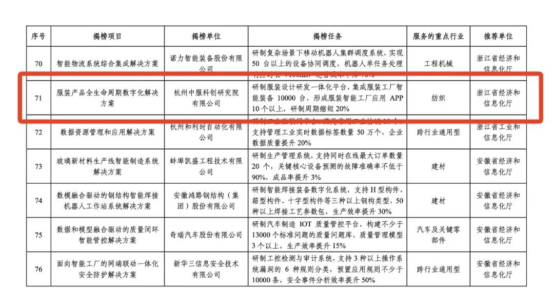 在工业和信息化部会同市场监管总局开展的2023年度智能制造系统解决方案揭榜挂帅项目申报工作中,中国服装科创研究院作为全国唯一的服装业数字化平台服务商,成功入选该项目名单。此次入选展现了中国服装科创研究院在智能制造领域的卓越实力和行业领先地位。2023年度“揭榜挂帅”项目的核心任务是聚焦智能工厂和智慧供应链建设,特别强调在21个智能制造系统解决方案的攻关方向上的创新。这一政策旨在发掘和培育掌握关键核心技术、具备强大自主可控供给能力的单位,推动工艺、装备、软件、网络技术的深度融合,打破传统制造业的局限,提升智能制造集成服务能力。中国服装科创研究院在此次项目中的入选,得益于在智能制造系统解决方案中的多项创新。研究院不仅推动了服装设计、生产流程的自动化和数据驱动的创新,而且在智能工厂建设和智慧供应链管理领域取得了显著成效。特别是其在关键核心技术如计算机视觉、机器学习、物联网以及5G技术的应用,大大提高了生产效率,降低了成本,同时提升了市场响应速度和客户体验。截至今日,研究院已为安踏、特步、李宁、乔丹、影儿集团、之禾、歌力思、南山集团、乔顿、莎美娜 、富华等众多纺织服装龙头企业提供了数字化转型咨询规划和智能工厂全流程软硬件一体化解决方案,获得市场的深度认可和口碑。研究院橙织工业互联网平台携手杭州、厦门、泉州、广东、深圳和香港产业集群,通过数字化快反工厂等级认定服务和SaaS标准化软件,深度赋能和链接产业集群数千家中小微企业,为推动产业数字化和数字产业化作出重要贡献!中国服装科创研究院将持续致力于智能制造技术的研究和创新,为提升全球服装行业的数字化和智能化水平贡献力量。