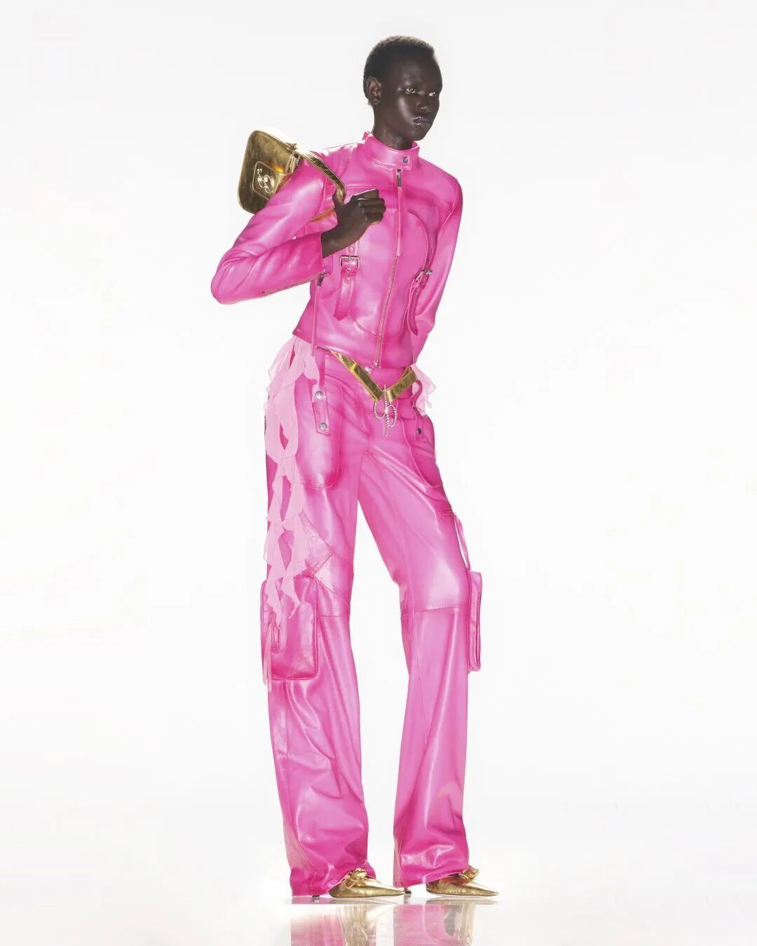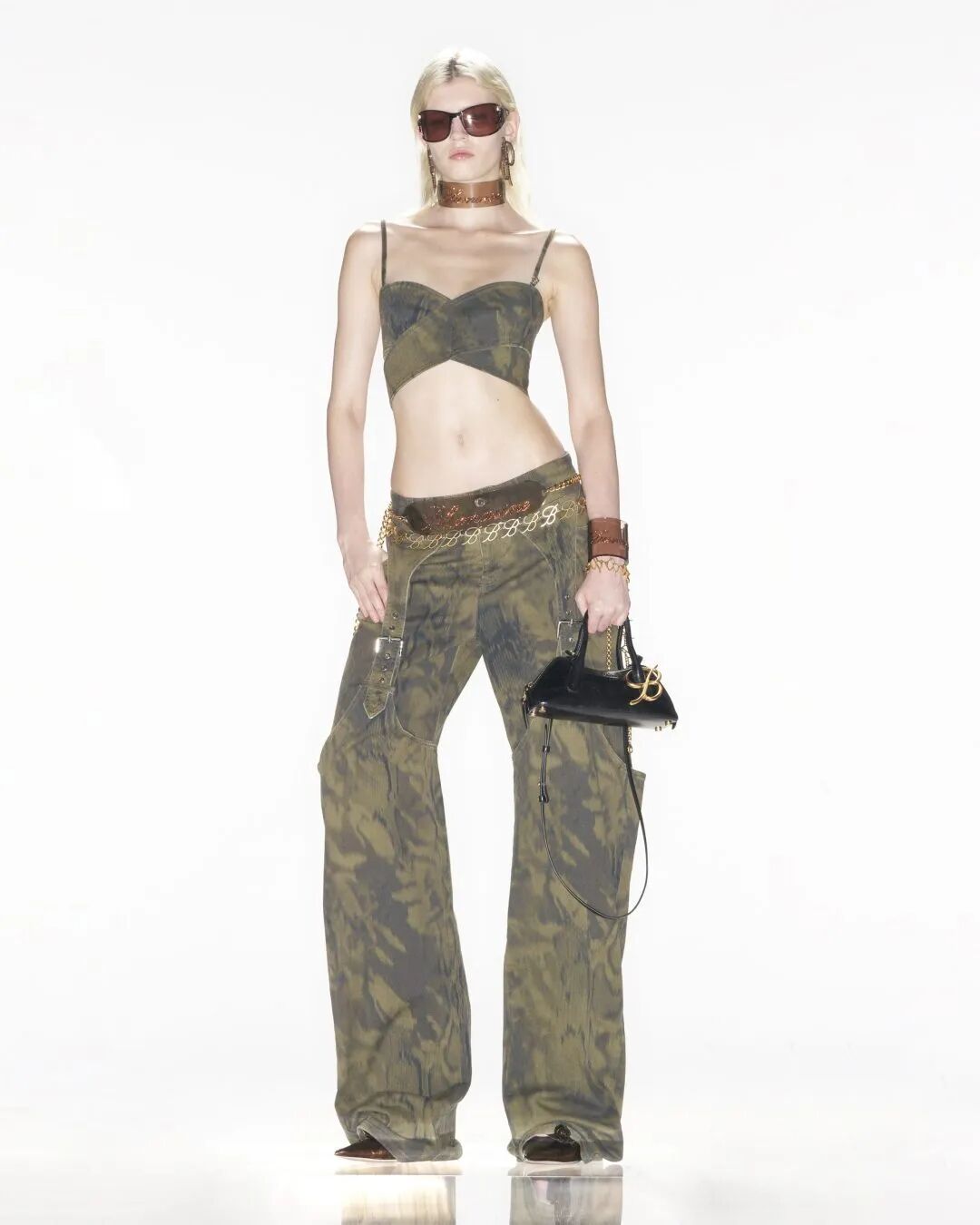 在Y2K穿搭中,常见的服装单品包括迷你裙、低腰牛仔裤、露肚装、紧身上衣等。同时,Y2K穿搭也注重细节的处理,如闪片、亮片、拉链等元素常被用于装饰。此外,Y2K穿搭还善于运用各种独特的图案和印花,如人字拼色、彩虹条纹、动物印花等,并常以巨大的配饰或者夸张的发型来突出个性。