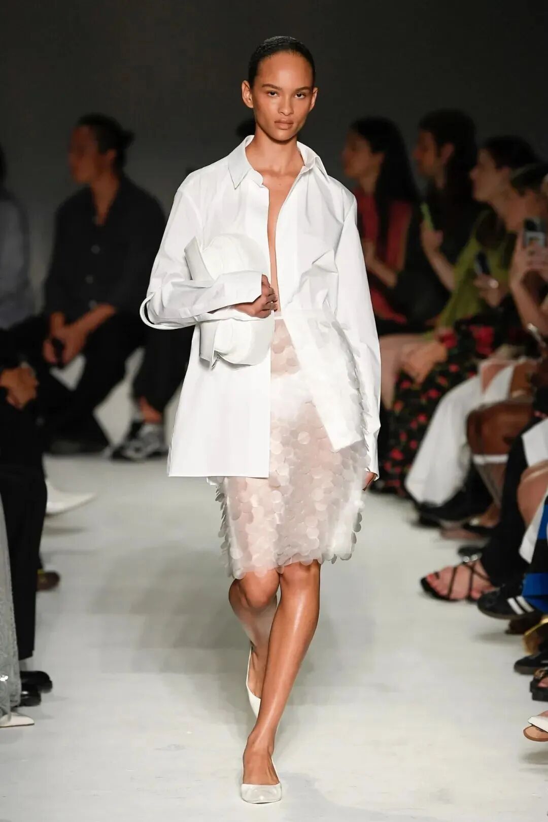 这些裙子吸引人们注意的不是亮片、网布或蕾丝,而是其优雅的性感。这种效果的实现要归功于与“安静奢华”相关的颜色。在 Prada,一个浓郁的酒红色模特脱颖而出,而 Carven、Altuzarra 和 Acne Studios 用灰色阴影“软化”了图像。16Arlington 用闪闪发光的亮片装饰的裙子增添了更多的质感、色彩和戏剧性,但又与经典白衬衫和圆领毛衣的休闲上衣相平衡。