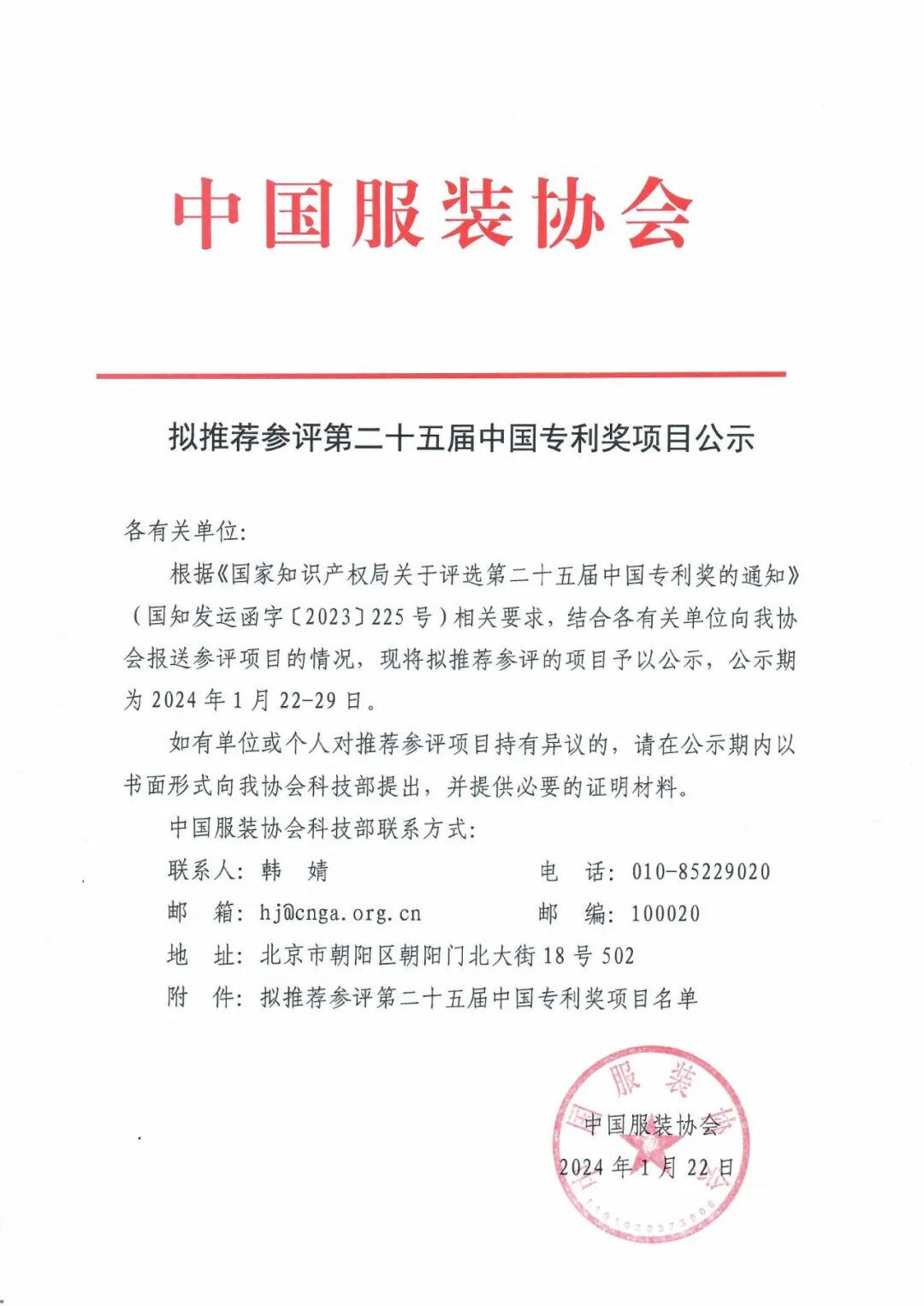 中国服装协会从每年的“中国服装专利奖”获奖项目中择优推荐“中国专利奖”,请各单位关注中国服装协会官方微信公众号发布的奖项申报通知,如有问题请联系中国服装协会科技部。