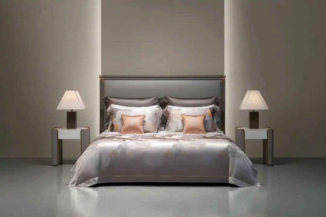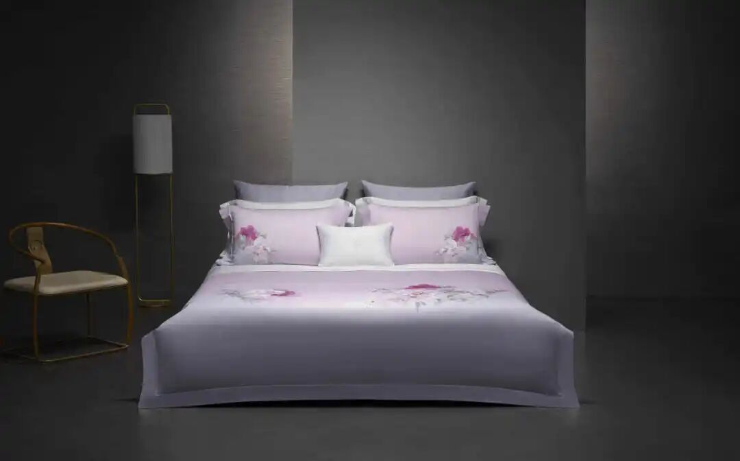 “芳华锦时”全棉手推绣床品套件采用50支全棉面料与绣花线。采用独版数码印花加手推绣刺绣工艺,印花部分以刺绣为蓝图,数码打印灵动再现刺绣丝线的神韵,丝缕毕现,栩栩如生,花朵叶脉层次丰富,充满生机。产品以牡丹为主花型,整个作品温雅恬润,华贵雍容。借鉴姚绣作品的原稿,在整体结构上,借鉴中式园林建筑中月洞门的设计结构,寓意团圆美满。同时运用粉色与灰色渐变的撞色,增加了画面的层次感和时尚感,在其月牙形弧度上,牡丹花、太湖石若隐若现的呈现其上。整体画面意境优美,色彩雅致。运用鲜艳的丝线和精妙的手推绣艺术打造出牡丹盛开的美景。作品不仅华美动人,给人以良好的视觉享受,更蕴含了富有和高贵的寓意,以及对幸福生活的美好祝福。
