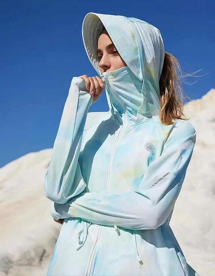 “骄阳2.0”防晒服创新采用渐变工艺,使每件色彩都与众不同。产品采用进口机器织造及特殊的制造工艺,全消光锦纶长丝采用开口组织的织造方式,氨纶弹性纤维纱线采用闭口组织的织造方式,均采用满穿的方式进行编织且形成的组织结构方向相同,不仅弹性高,还具有优异的抗紫外线以及接触凉感的性能,实现原纱防晒,经检测3次水洗后UPF仍达到1020。产品设计上可拆卸大帽檐在户外遮挡强光同时又不阻碍视线;袖口指洞设计贴合手背不怕晒,一体式口罩至眼睑,呵护面部肌肤,防止晒伤老化。从设计到生产加工过程减少污染排放,设计理念在环保条件下,经过中国纺织工业联合会社会责任办公室进行了全行业第一款防晒服的碳足迹测算,实现了节能减排,为未来行业发展作出了重要贡献。