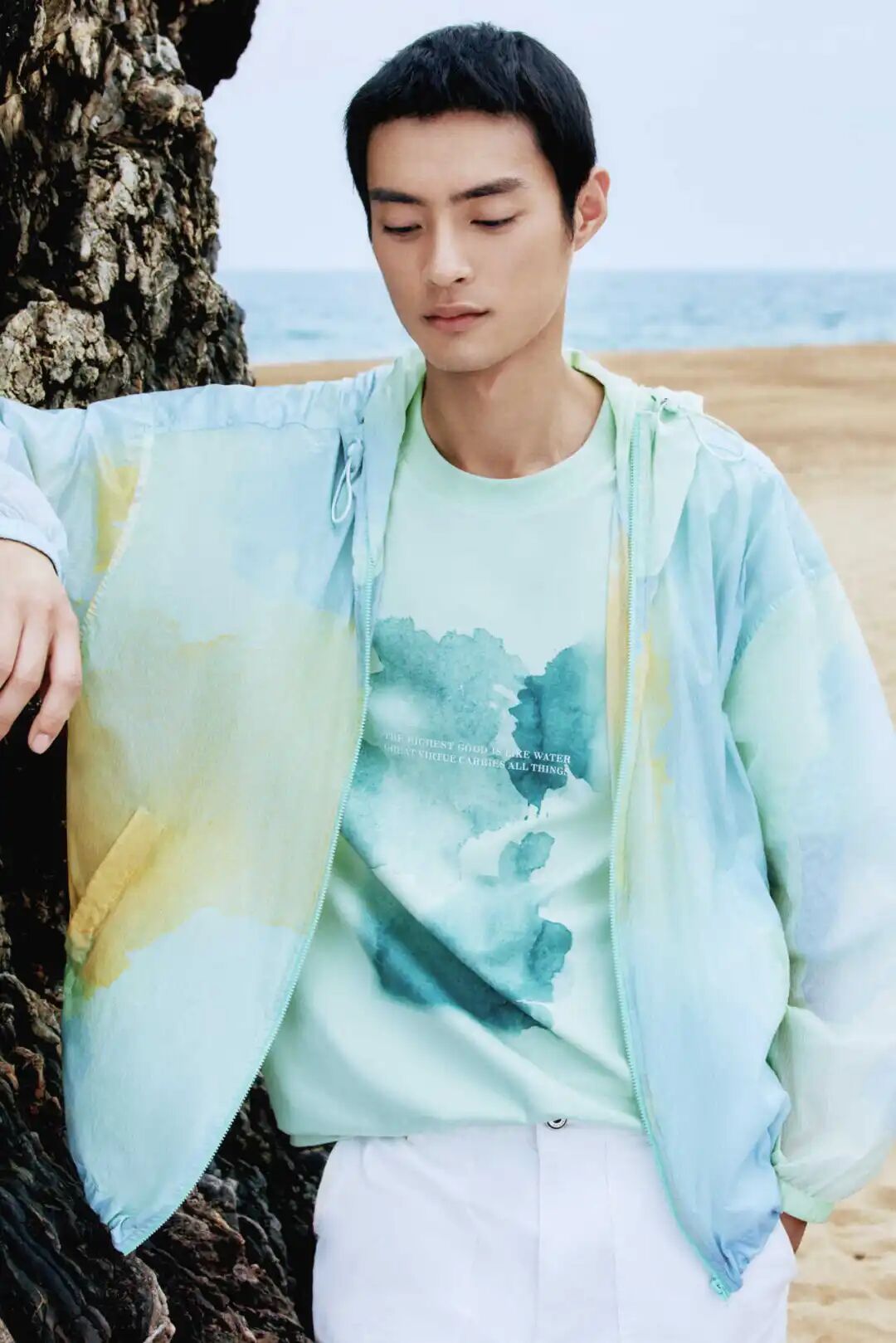 “蜉蝣美术馆2.0”海洋环保系列休闲夏装选用UNIFIREPREVE® OurOcean™再生纤维为核心原料,与新疆棉混纺海洋回收环保纤维,打造手感和品质兼具的新型环保再生面料,其环保纱线是由100%回收原料,包括消费后的塑料瓶制成,将其碎片化、颗粒化,经过纺丝、加弹工艺生产制成的高品质、高性能的再生纤维。产品将木糖醇凉感整理剂通过常规浸轧或涂层等方式附加到面料上,使其具有瞬间凉感的功能。设计上,用海水晕染与日出渐变图案体现海洋的静谧与变幻,图案整体搭配治愈的低饱和色彩,将可持续理念设计入衣,倡导大家关注海洋生态。