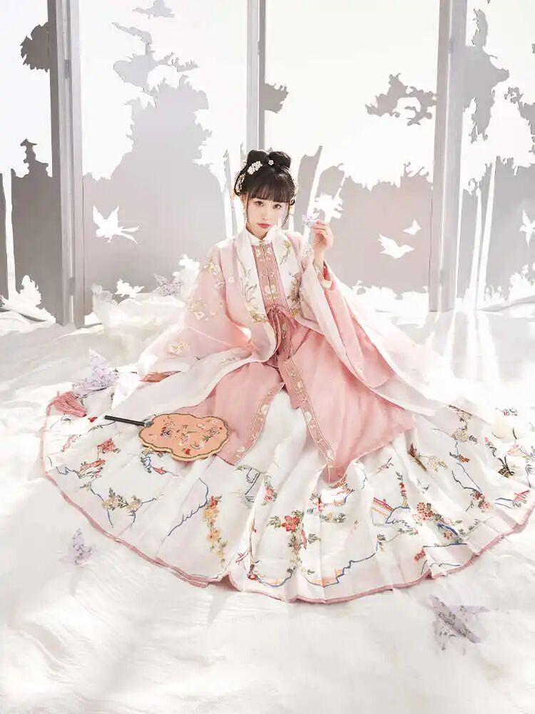 “美哉”明制汉服以“白色暗花纱绣花鸟纹裙”为灵感,提取山东博物馆馆藏中的花鸟纹裙裙身纹饰,将春景定格在马面裙上。产品由披风、立领对襟长衫和马面裙组成,披风和立领对襟衫在形制上与马面裙对应,立领、对襟衫、门襟、运用三种不同刺绣针法,通过对绣花机器进行改造,使花型更加饱满逼真。大身选用亚麻/真丝/棉面料,给予马面裙良好的亲肤性和透气性,亚麻的加入使裙身微带筋骨,能够较好地保持马面裙的形制效果。产品设计上,延续花鸟裙原本氛围基础,改变原有绣花针法,使生物形态更加灵动,山水细节更加精致;特殊针法和金属丝线的加入,打造了华丽贵气的视觉效果。