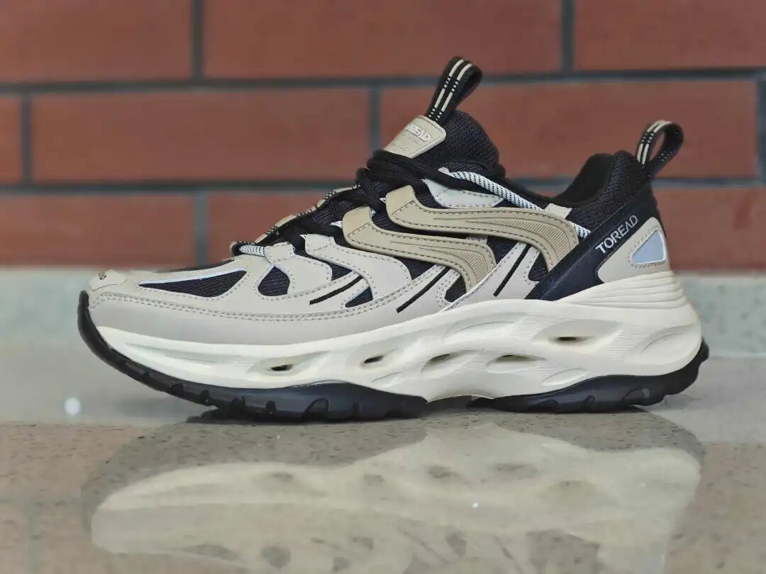 “775二代”多功能休闲溯溪鞋橡胶鞋底采用雨蛙特有的吸盘脚趾仿生设计,提取并使用在鞋底花纹设计上,增强在湿滑的路面、水流、潮湿的岩石等多种环境的抓地力,达到防滑效果;中底内部有横向凹槽,凹槽的两端与中底侧孔洞贯穿。当水进入鞋内时,积水就会通过横向凹槽再从侧孔洞迅速排出,达到鞋内无积水现象,提升鞋子的速干性能。鞋面运用提花机台技术制造,利用组织排列及数位提花生产工艺技术,勾勒出高强结实的组织结构纹理,鞋面采用防泼水处理,可延缓鞋面短时内被雨水渗透,有效抵挡瞬间泼水。