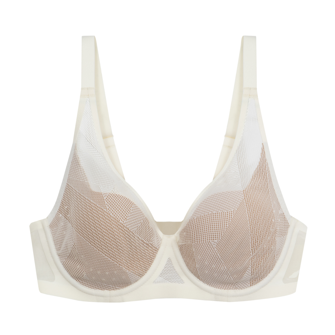 人体美学内衣采用锦纶和氨纶制成的超轻薄大孔洞随意裁面料,搭配亲肤网眼,始终保持透气透湿,清爽舒适。依据人体曲线,设计W碗围软支撑结构,稳定承托乳房,侧翼处通过胶骨贴片,调整乳侧赘肉,达到视觉人体之美。原创花型采用激光镭射+定位冲切技术组合运用,贴肤净痕无缝线,全方位提升亲肤舒适度。产品将防凸点布杯工艺以及洞洞杯两项技术相结合,打造出新一代透气性更好的防凸点花瓣布杯。