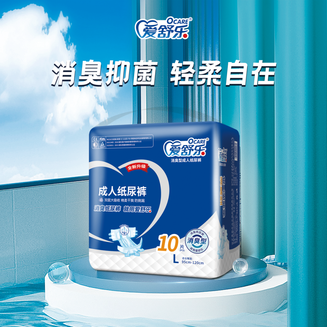 消臭型成人纸尿裤针对人体曲线、人体工学剪裁,双层立体防漏,和肌肤亲密贴合,穿着更舒适,有效防止侧漏;采用企业独创“活护”消臭技术+超倍效瞬吸高分子,有效抑制大肠杆菌等致臭因子的产生,降低尿液产生的臭味,洁净清新不尴尬;瞬吸丝柔非织造布表层及快吸速渗导流层,能够帮助尿液快速下渗,不怕回渗,表层更干爽;纳米纤网呼吸孔,透气不闷热;高分子吸水树脂采自日本住友精化株式会社,可吸收自身体重一千多倍的液体;木浆由美国进口,可自然降解;智能提醒尿显,及时提示,更贴心的呵护。产品基于企业实用新型专利2020 2 1198460.7《一种抗菌除臭护理垫》,发明专利2018 1 0196882.1《防反渗型液体吸收芯》等而开发。