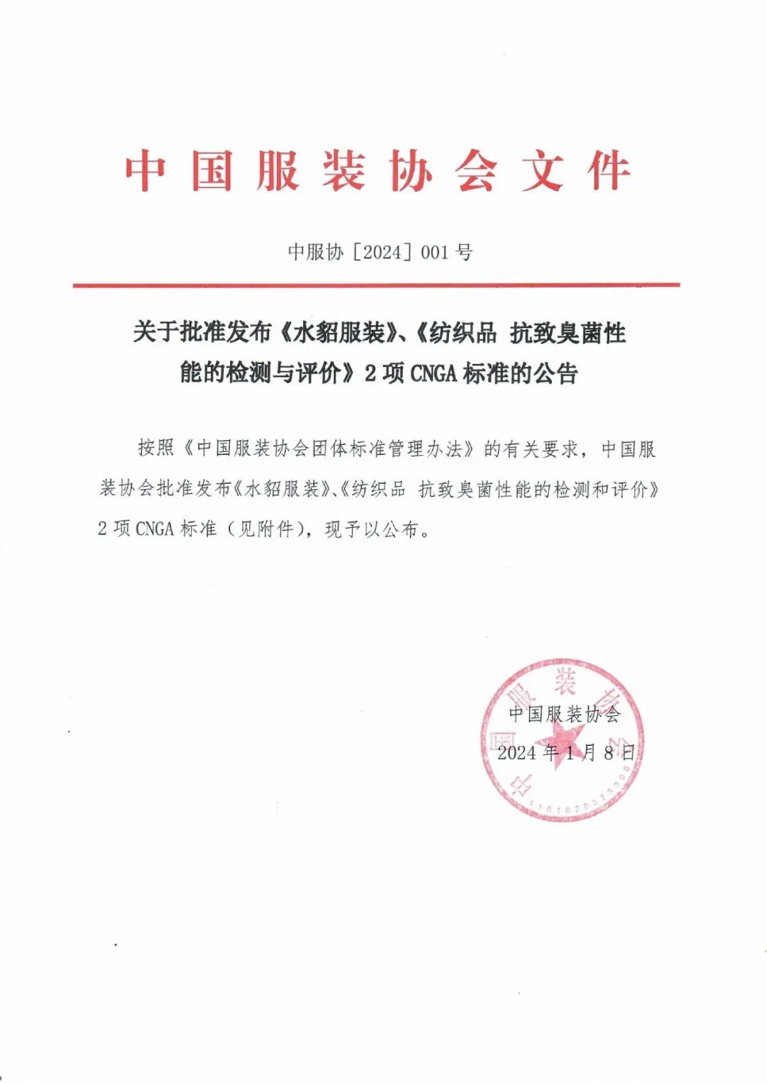 关于批准发布《水貂服装》、《纺织品 抗致臭菌性能的检测与评价》2项CNGA标准的公告