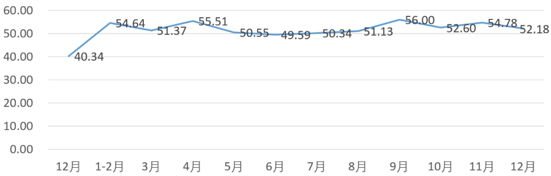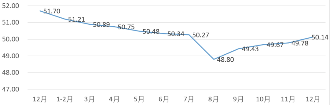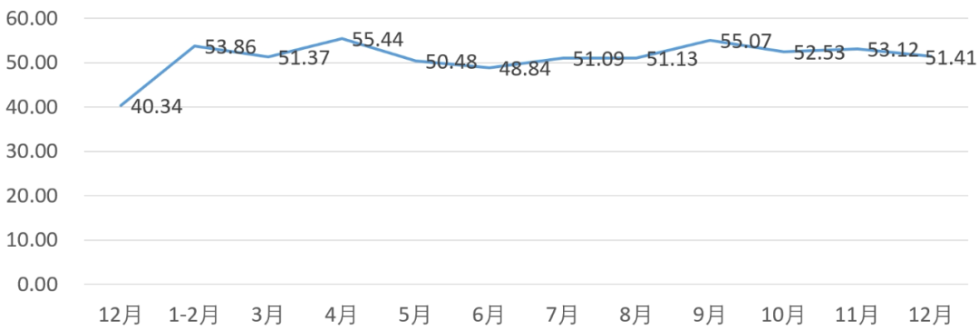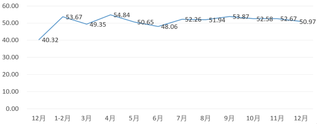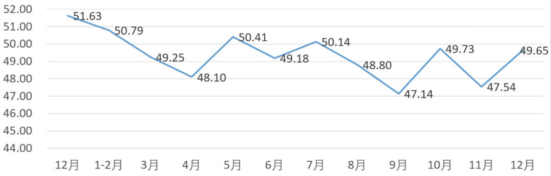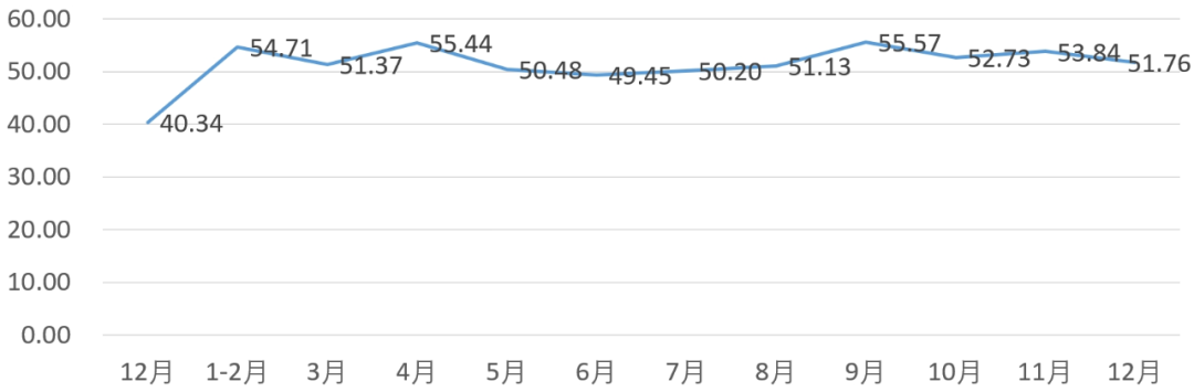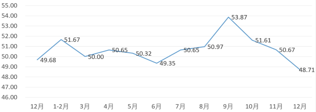 分项指数中,销量指数为52.18,比11月的54.78下降2.60个百分点;平均售价指数为51.41,比11月的53.12下降1.71个百分点;盈利指数为51.76,比11月的53.84下降2.08个百分点;综合成本费用指数为49.65,比11月的47.54上升2.11个百分点;库存指数为50.14,比11月的49.78上升0.36个百分点;电商销售指数为49.65,比11月的53.19下降3.54个百分点。