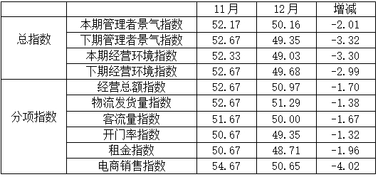 分项指数中,经营总额指数为50.97,比11月的52.67下降1.70个百分点;物流发货量指数为51.29,比11月的52.67下降1.38个百分点;客流量指数为50.00,比11月51.67下降1.67个百分点;开门率指数为49.35,比11月的50.67下降1.32个百分点;租金指数为48.71,比11月的50.67下降1.96个百分点;电商销售指数为50.65,比11月的54.67下降4.02个百分点。